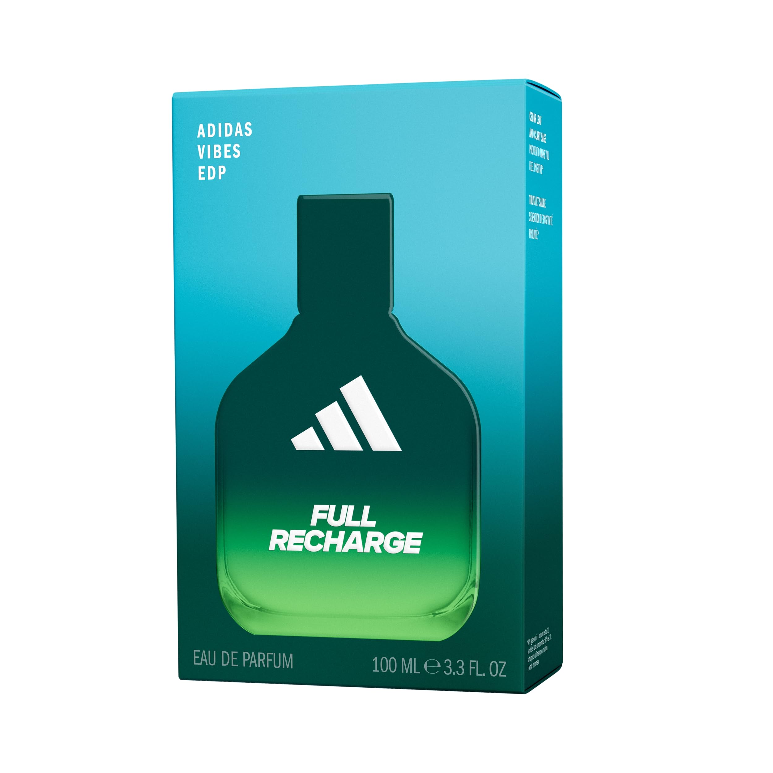 Feel the vibe and feel uplifted with the new adidas fragrances. Vibes Full Recharge Eau de Parfum is proven to make you feel positive*. Invigorating and fresh, like a weekend away from the city and a back to nature feeling. With Cedar leaf and Clary Sage. The long lasting fragrance, with Basil & Sage natural essential oils, has a vegan formula and is dermatologically tested. The packaging is made with recycled materials ** Discover the full Vibes fragrance collection. 6 mood fragrances. *81% agreement in a consumer test of 106 participants. **96% PCR CAP, 25% PCR Glass, FSC carton