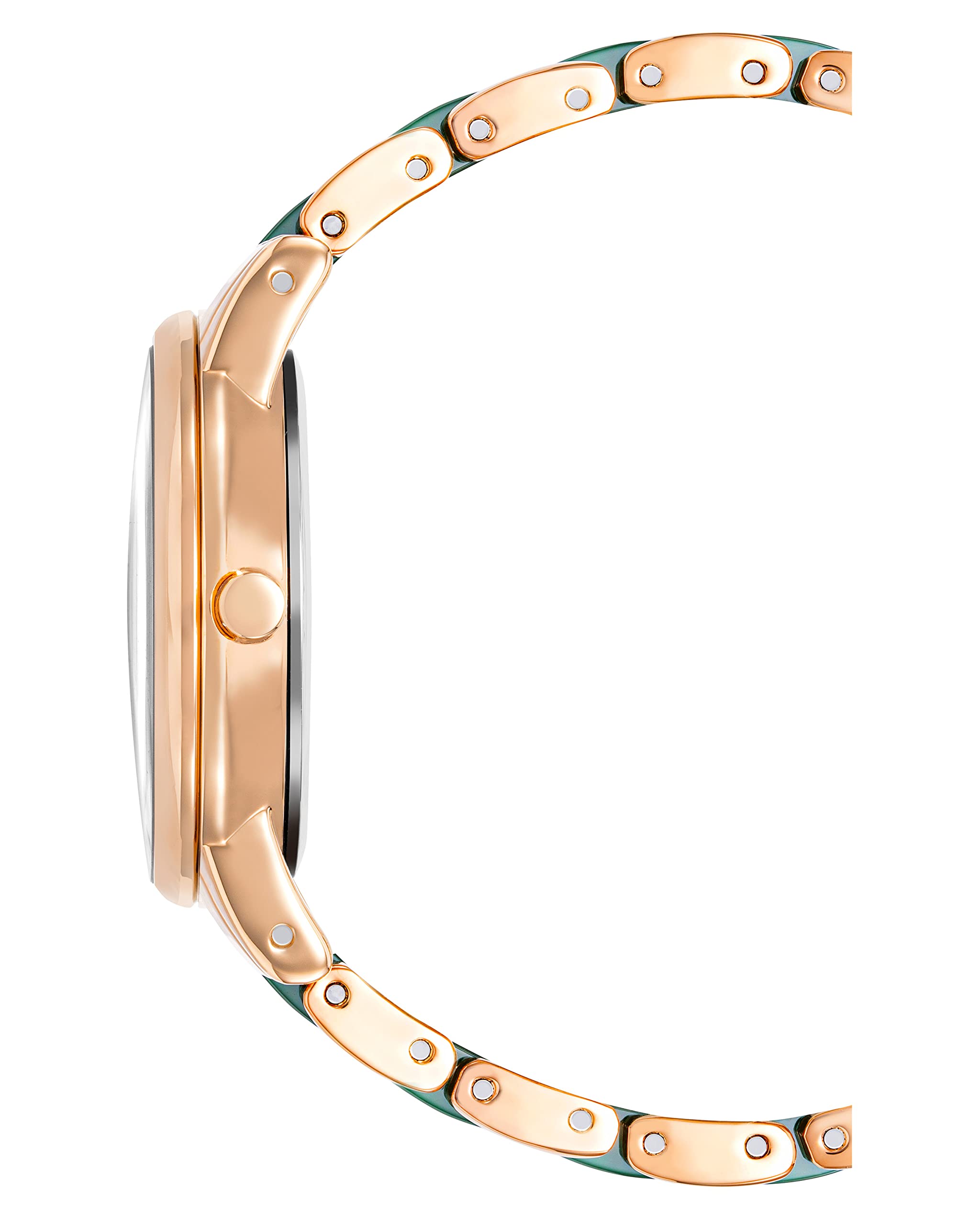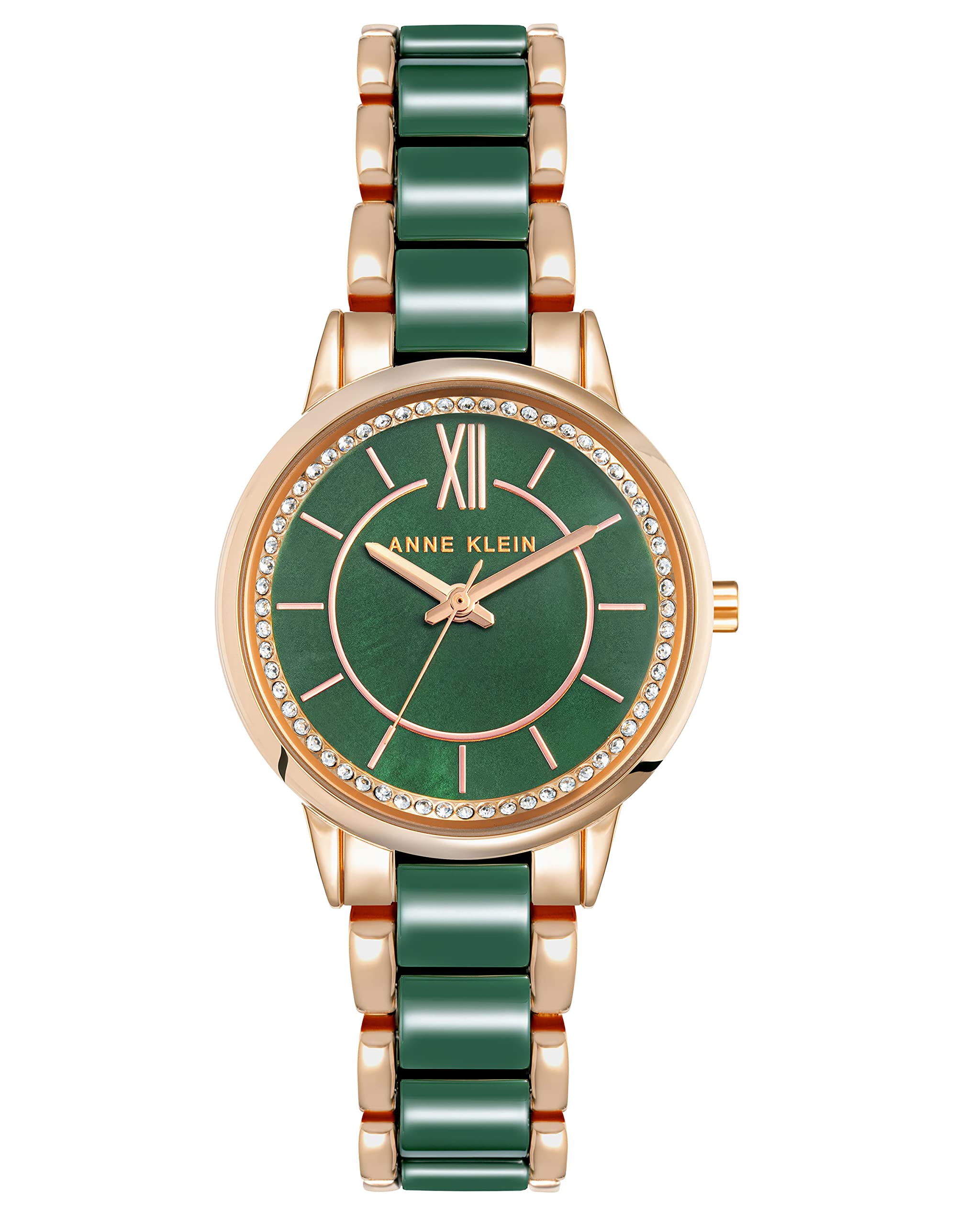 Case Nickel compliant rose gold round 32mm x 38.5mm Dial Green mother of pearl Bezel Rosegold Index Sticks w Romans Band Nickel compliant rose gold with green ceramic Closure Jewelry Clasp WR 100 feet