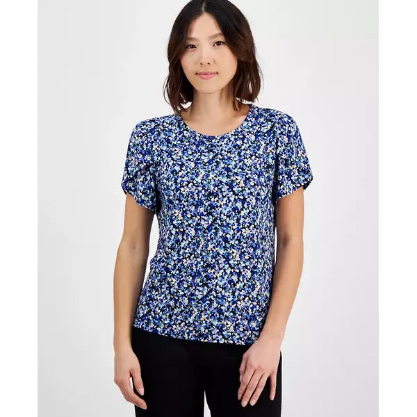 A pretty print and gathered tulip sleeves elevate your polished look with this petite top from AK Anne Klein.