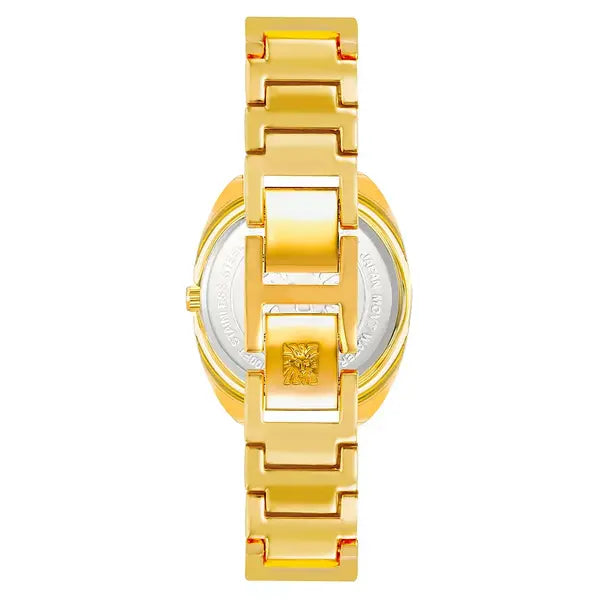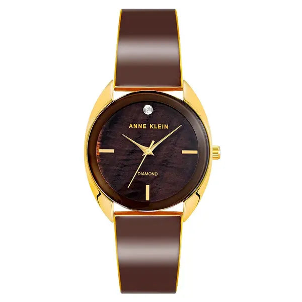 This gold-tone watch from Anne Klein can be worn anywhere. With its brown mother of pearl dial and brown band and bezel, this watch can be worn as an everyday piece or an elevated accessory. Style #AK-4040GPBN