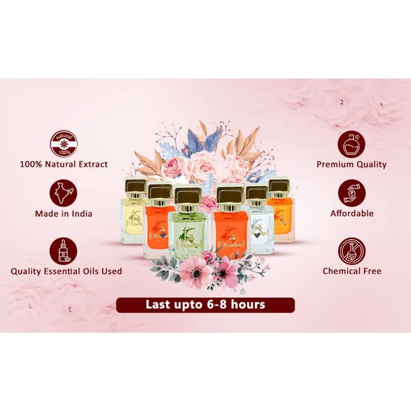 PACKAGE INCLUDES - Our floral perfume set contains long-lasting premium fragrances that come in beautiful bottles and a gift inside a sample perfume fragrance. Aranyam manβs perfume body spray is made with hand-plucked flowers which are absolutely natural and alcohol-free and be the perfect gift for any occasion and perfect for a date night fragrance and as a date night perfume!