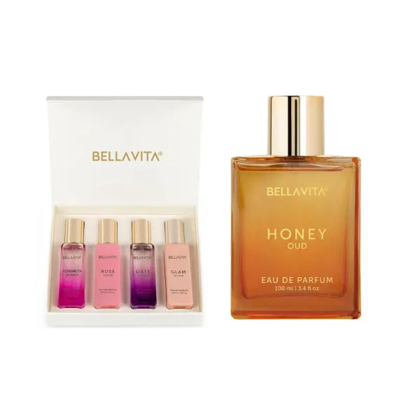 BellaVita Luxury Gift Set Combo For Women's - Honey Oud & Women's Gift Set | Vannila, Floral, Bergamot, Sweet & Spicy | Long Lasting Perfume for Women | Vegan & Cruelty Free - (4 * 20 ml + 100 ml)