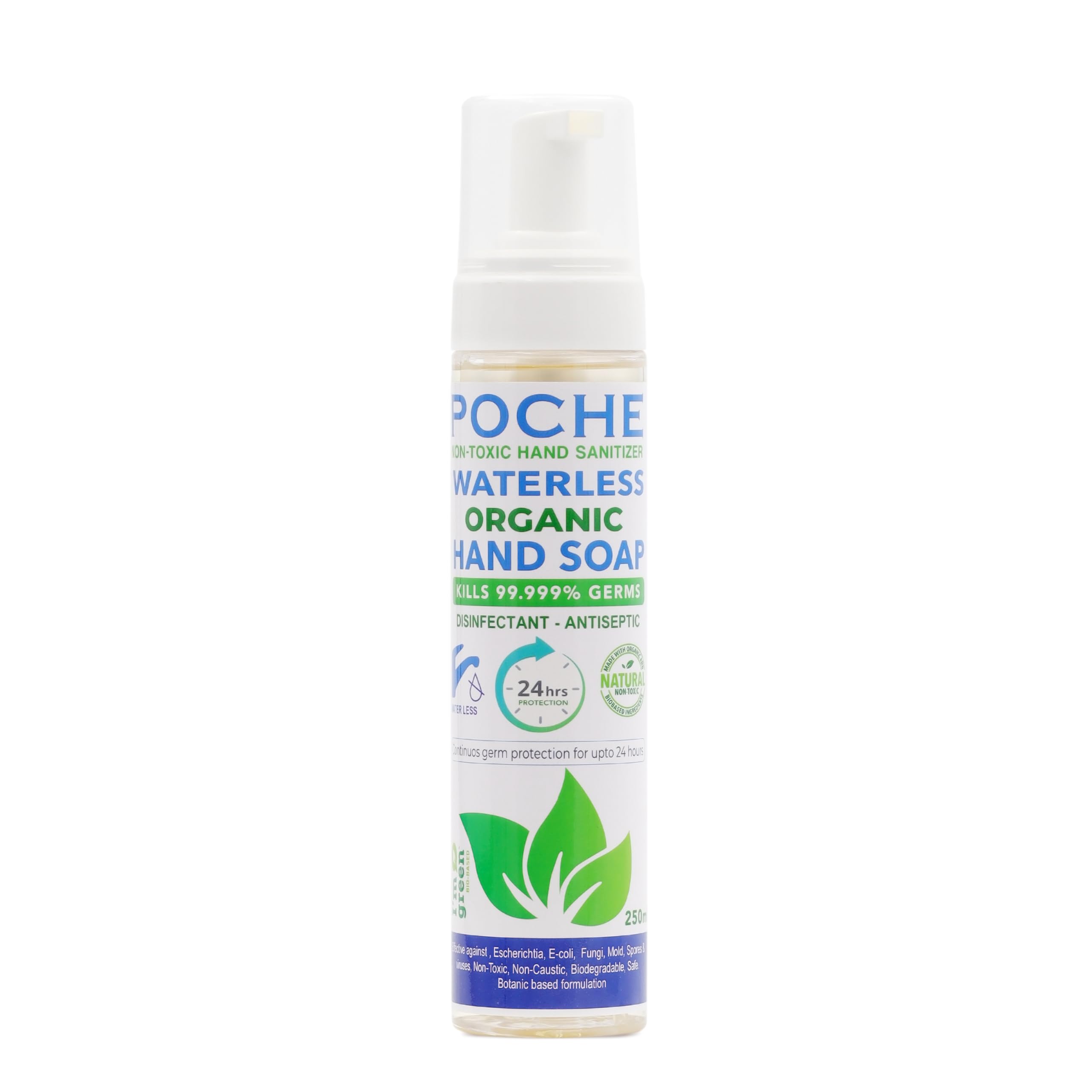 Poche Organic Waterless handwash, is an unique product from Bionatura which has the ability to eliminate 99.999% germs and keeps you safe from harmful bacterial, viruses & fungus. The handwash is prepared from the Organic . natural and bio-based ingredients. There fore it is 100% Safe for the living human beings and for our eco system.