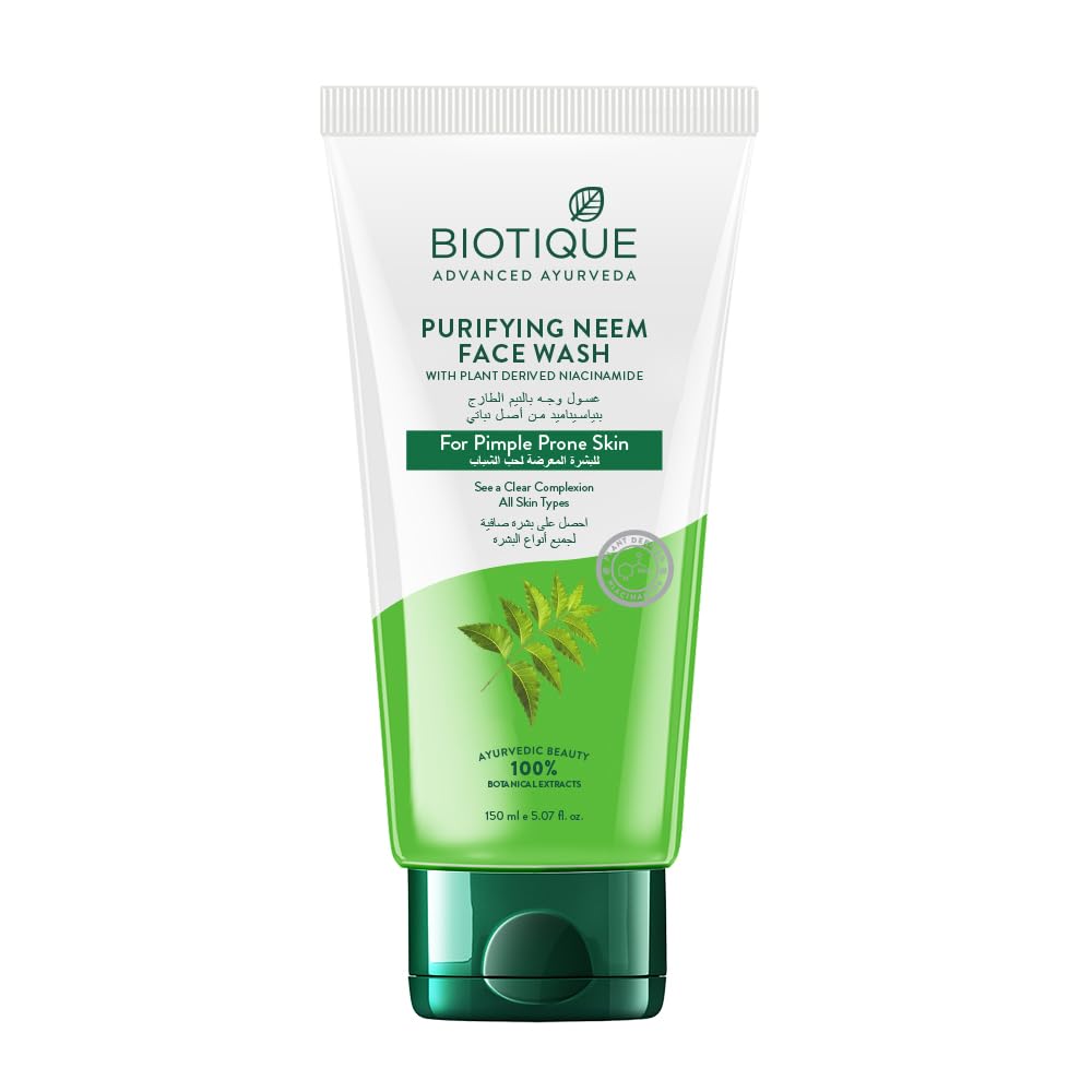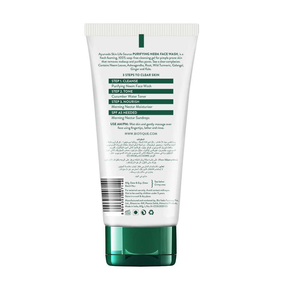 This fresh foaming 100% soap-free cleansing gel removes makeup, purifies pores and prevents pimples. Use regularly for a clear, pimple-free skin. Contains Neem Leaves, Neem Bark, Ashwagandha Root & Galangal.