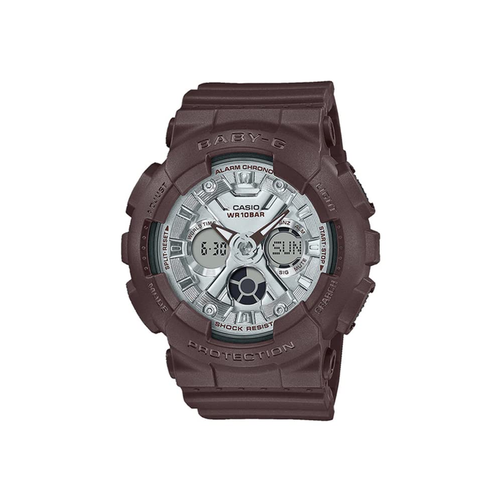 Deep matte brown case and band, a shiny dial treated with mirror vapor deposition — the very picture of delicious, not-too-sweet, dark chocolate wrapped in silver foil. Regular timekeeping Analog: 2 hands (hour, minute hand moves every 20 seconds - Digital: Hour, minute, second, pm, month, date, day World time - 29 time zones (48 cities + coordinated universal time), daylight saving on/off Case / bezel material: Resin Resin Band