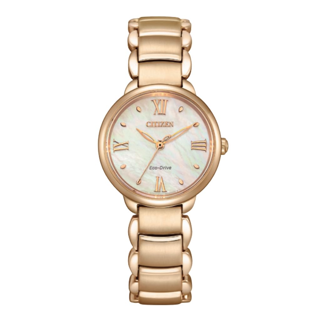 Mother of Pearl dial enhanced by gold-tone hands. Gold-tone stainless steel case with a gold-tone stainless steel band. Eco-Drive movement. 50 meters / 165 feet water resistance. Fixed bezel. Scratch Resistant Sapphire crystal. Solid caseback. Deployment clasp. Pull / Push crown. Case size 28 mm x 8 mm. Citizen EM0929-81Y L Series Watch.