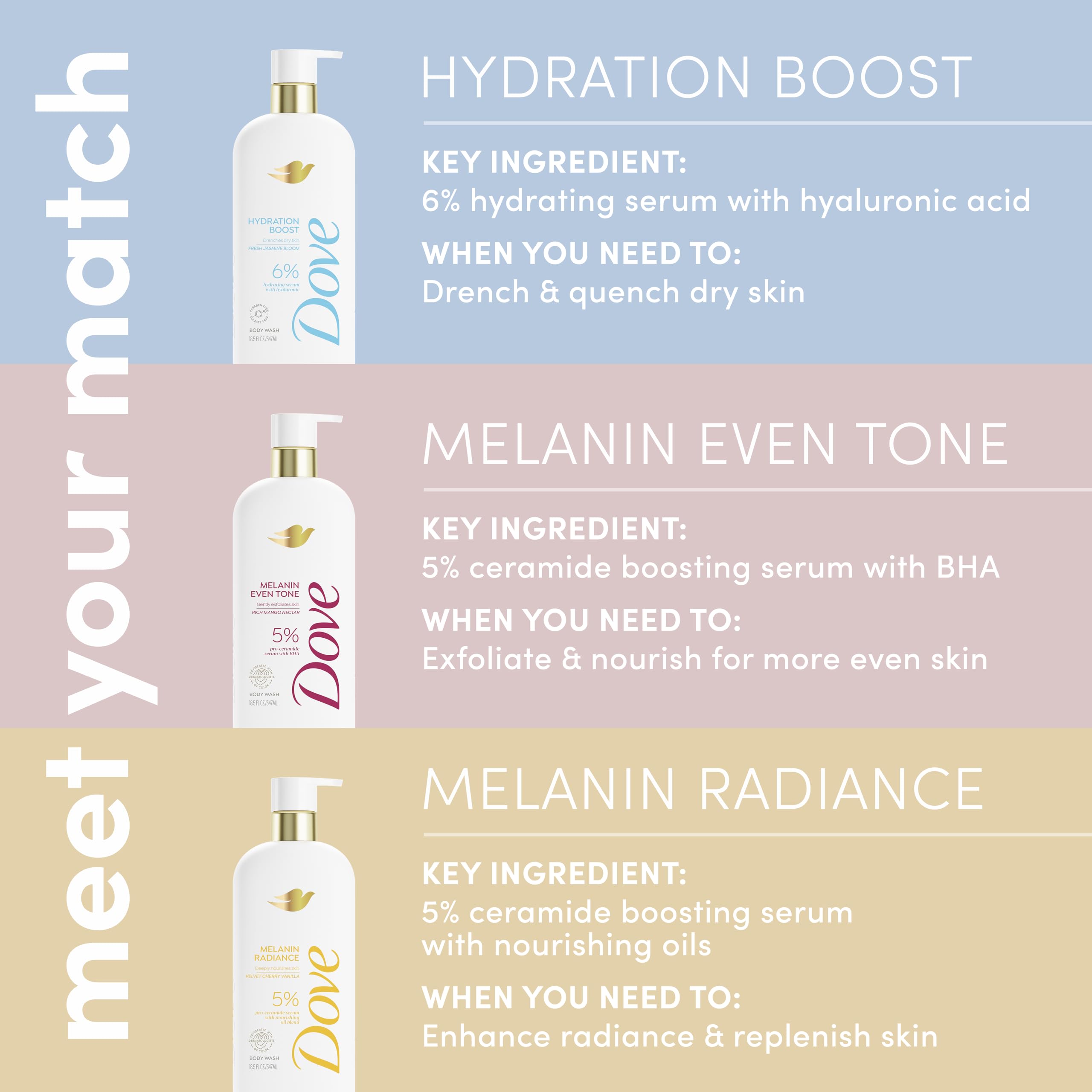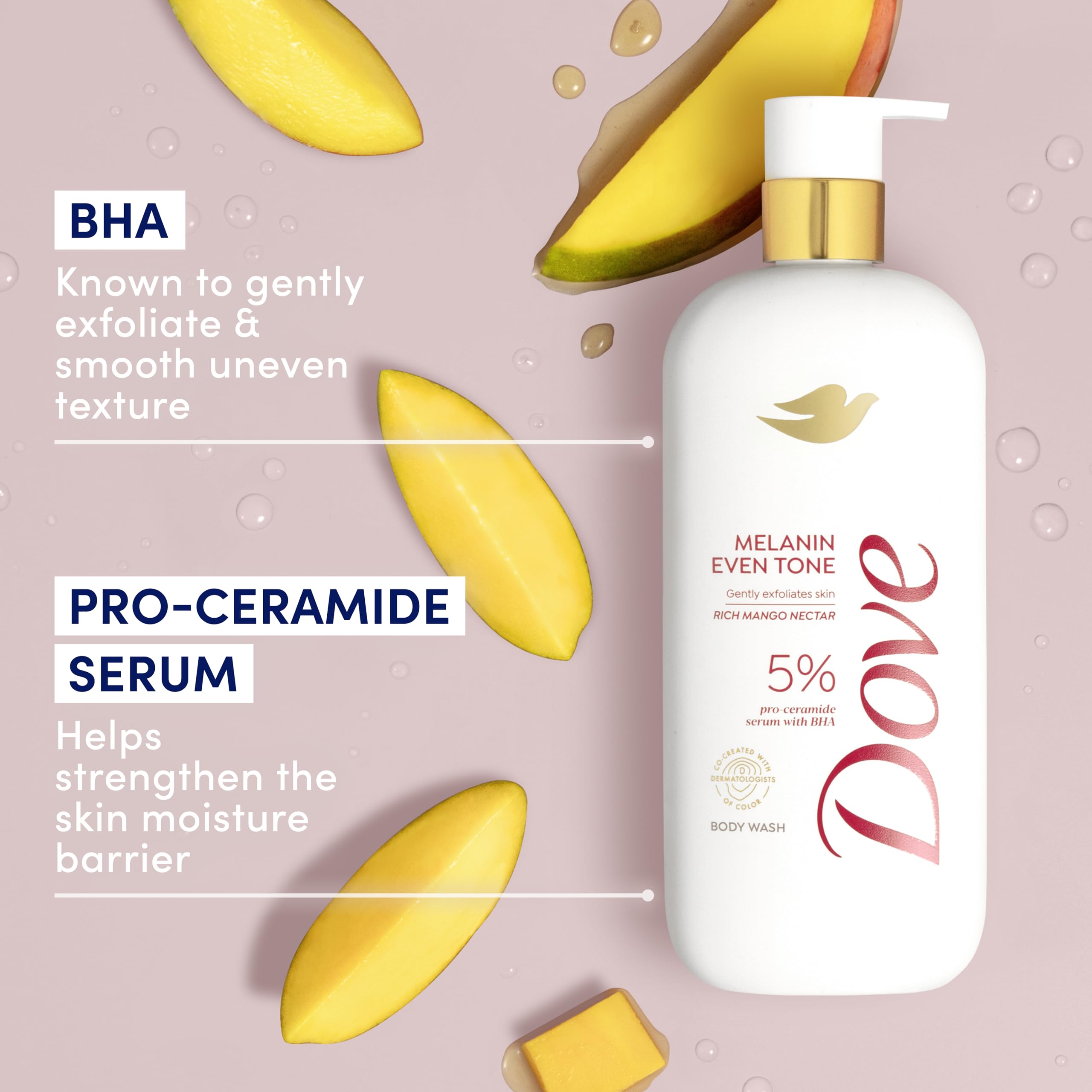 Looking for smooth, even skin? Dove Melanin Even Tone Body Wash, formulated with a 5% pro-ceramide serum with BHA gently exfoliates and nourishes to help maintain even skin tone. This rich exfoliating body wash transforms into a creamy lather, filling your shower with notes of mango and coconut. Has your skin been missing out?Β NewΒ Dove Serum Shower Collection is infused with active skin care ingredients to supercharge your body care routine. Quench thirsty skin with hydrating serum + hyaluronic acid, help prevent acne with acne clearing salicylic acid treatment, or recharge skinβs glow with brightening serum + vitamin C. Designed with you in mind, Dove's Melanin Even Tone Body Wash was co-created with board certified dermatologists of color to address the most common melanin-rich skin concerns, bringing expert care into your shower. The rich formula is also infused with pro-ceramides for stronger, more healthy-looking skin and BHA for smoother skin and even skin tone. Dove is the #1 Dermatologist recommended body wash brand.β―This cleanser is made with naturally-derived gentle skin cleansers, no sulfates or parabens and is PETA-certified vegan.