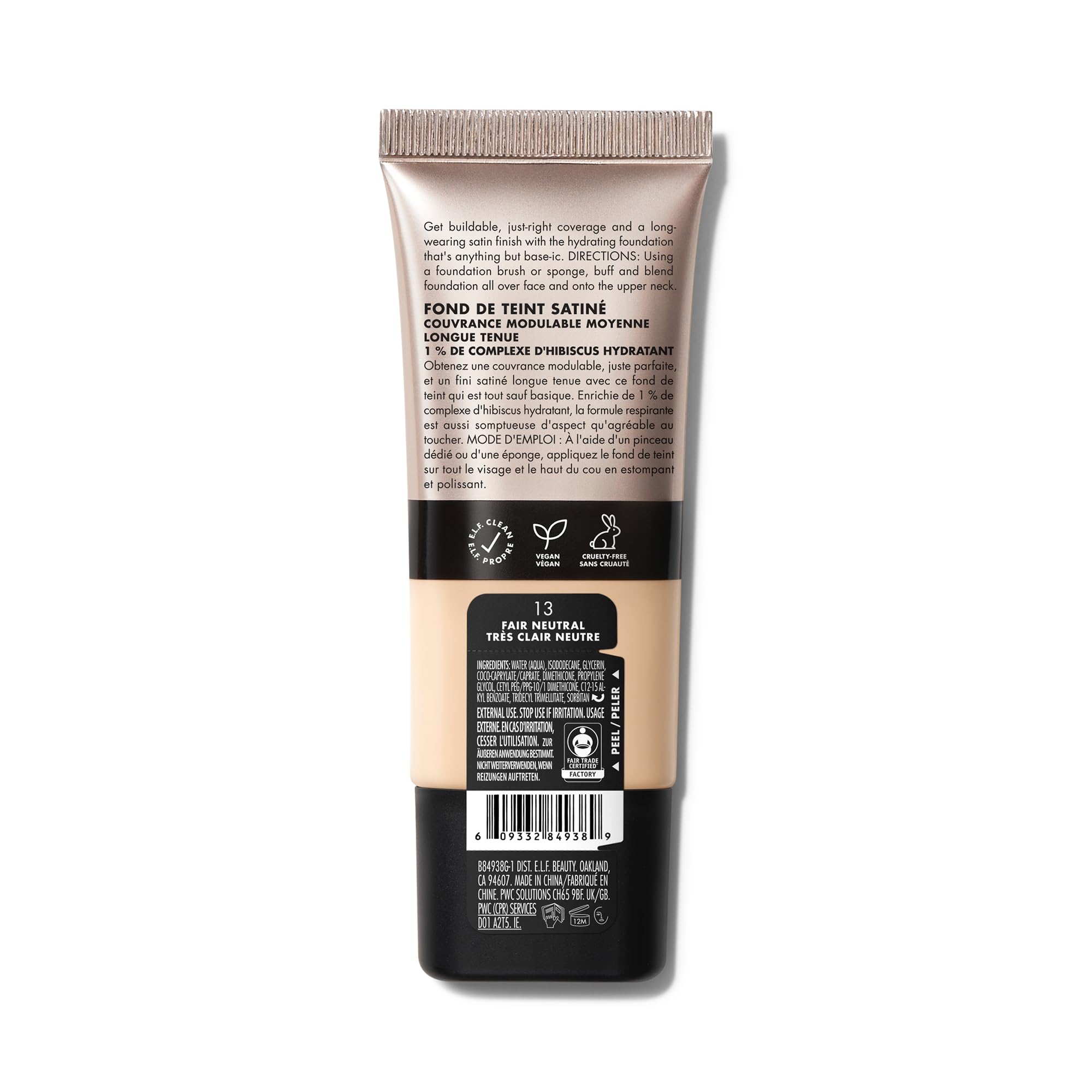 Hit that dreamy sweet spot between full beat and barely there with e.l.f. Cosmetics’ long-wearing Soft Glam Satin Foundation. Infused with 1% Hydrating Hibiscus Complex, plus fruit extracts, this breathable liquid foundation won’t clog pores and feels as good as it looks—no caking or heaviness here, just smooth, satiny skin.What it is:Long-lasting satin finish foundation that delivers medium buildable coverageBreathable formula doesn’t look or feel cakeyInfused with 1% Hydrating Hibiscus Complex, plus pomegranate, blueberry and goji berry extractsWhy you'll love it:Available in 36 shades for a wide range of skin tonesNon-comedogenic (won’t clog pores)Just-right coverage at an OMG priceIngredients may change or vary from time to time. Please refer to the packaging of the product received for the list of ingredients in your particular productProud to be 100% Vegan, Cruelty-Free and Leaping Bunny Certified. Because kindness is chic.