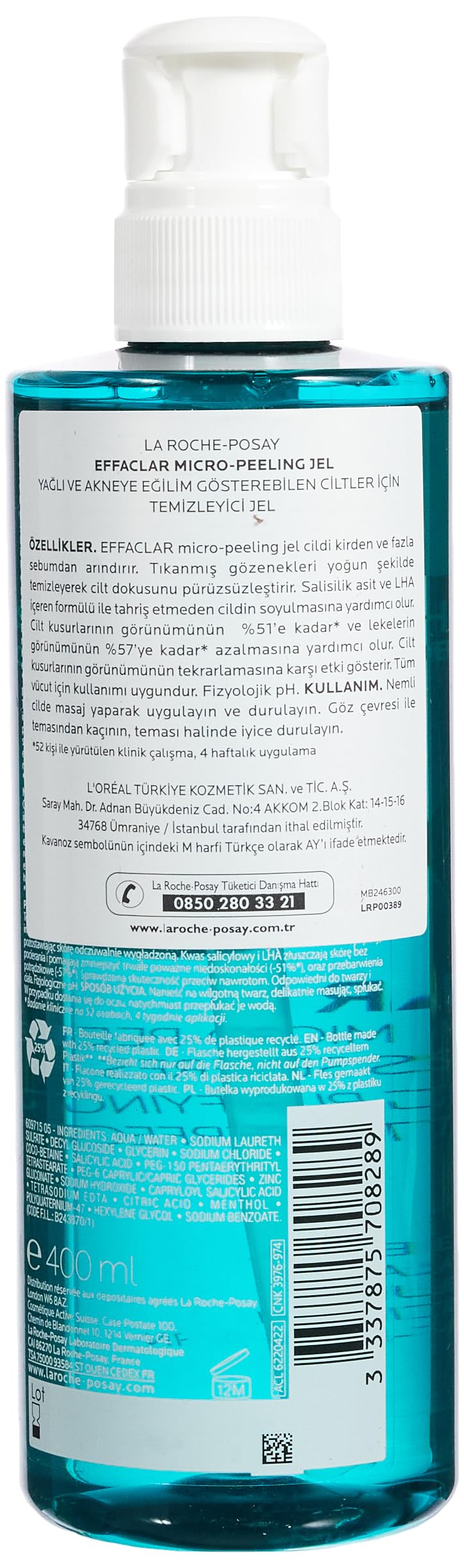 The first La Roche-Posay cleanser formulated with micro-exfoliating and purifying agents. Acts on persistent imperfections and sebum while bringing a maximum of comfort to acne-prone skin, even on body. Formula tested under dermatological control. Hypoallergenic. Physiological pH. Tested on oily acne-prone skin. Allergy-tested. Thanks to selected exfoliating agents that leaves the skin texture smoother, EFFACLAR Micro-peeling gel intensely purifies oily skin, deeply unclogs pores, and removes excess sebum. It helps reducing progressively and durably persistent imperfections including marks, and preventing recurrence.