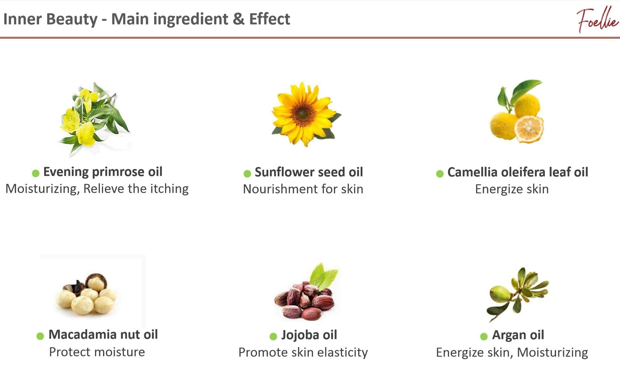1) Product Name : Eau de foret 2)Category : Inner Beauty 3) Scent Info : Woody fragrance Containing vitality of the refreshing forest 4) Features · 6 Vegetable oils help keep the skin healthy · No contain any high-risk 8-grade fragrance · Allergy-free 5) Function · wash the impurities from the cleansing spot · Help prevent unpleasant body odors 6) Main Ingredients : Evening primrose oil, Camellia oleifera leaf oil, Argan oil Macadamia nut oil, Jojoba oil, Sunflower seed oil 7) Volume : 5ml 8) How to Use · Daily: Drop it one or two times to the underwear · Menstrual period : Drop one or two times on the sanitary napkin.