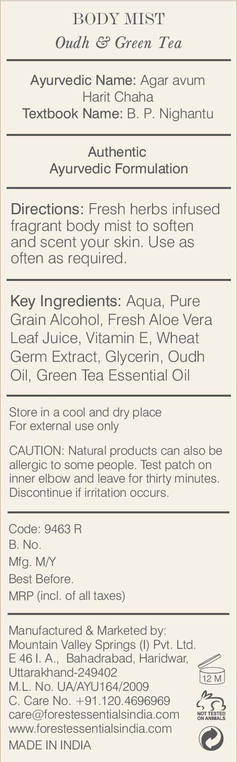 Forest Essentials Green Tea & Oudh Body Mist 100 ml By IndianMedicalStore