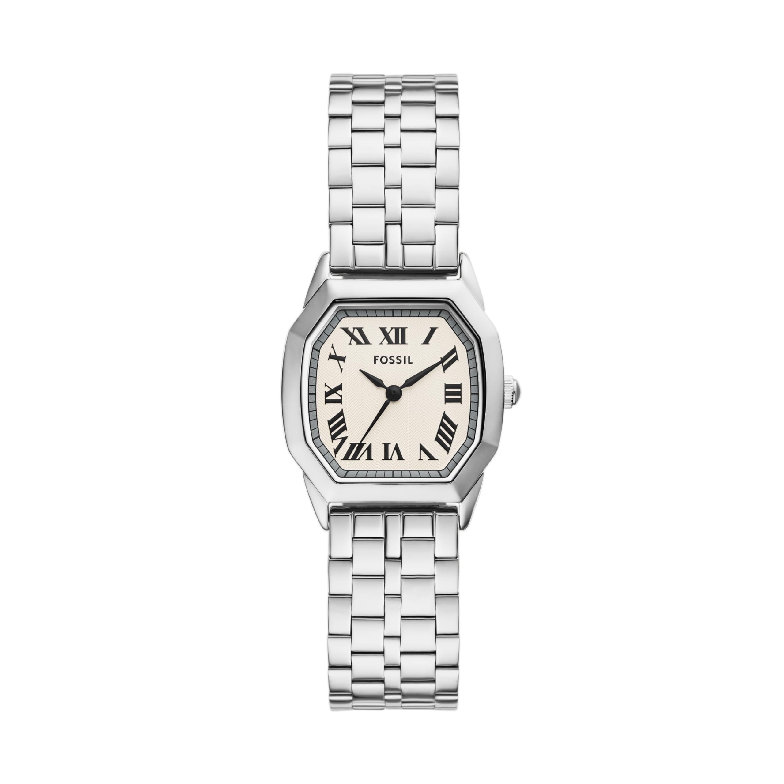 Inspired by a classic archival style, Harlow brings the sophistication of the past to modern day. This intricate polished stainless steel five-link bracelet watch features an octagonal-shaped case, textured cream dial and three-hand movement.