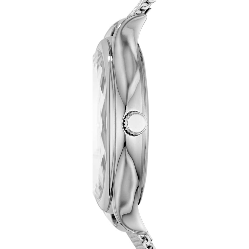 Case Thickness: 10 Mm, Case Size: 34 Mm, Band Width: 14 Mm. Band Material : Silver Tone Stainless Steel Mesh, Strap Inner Circumference: 175+/ 5Mm Clasp Type : Safety Mesh Buckle. Glass Type: Mineral Crystal With Silver Dial With Silver Tone Stainless Steel Case. Water Resistant: 5 Atm, 50 M.