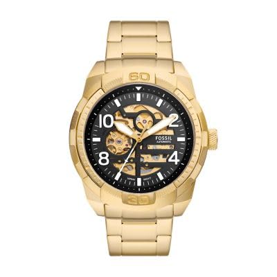 This 48mm Bronson features a black satin dial, automatic movement and gold-tone stainless steel bracelet.
