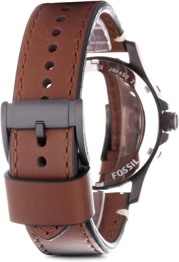 Item Shape: Round Dial window material type: Mineral Display Type: Analog Clasp: Buckle Case material: Steel Black IP Treatment Case diameter: 45Band Material: Leather Band width: 22 millimeters Band Color: Brown Dial color: Black