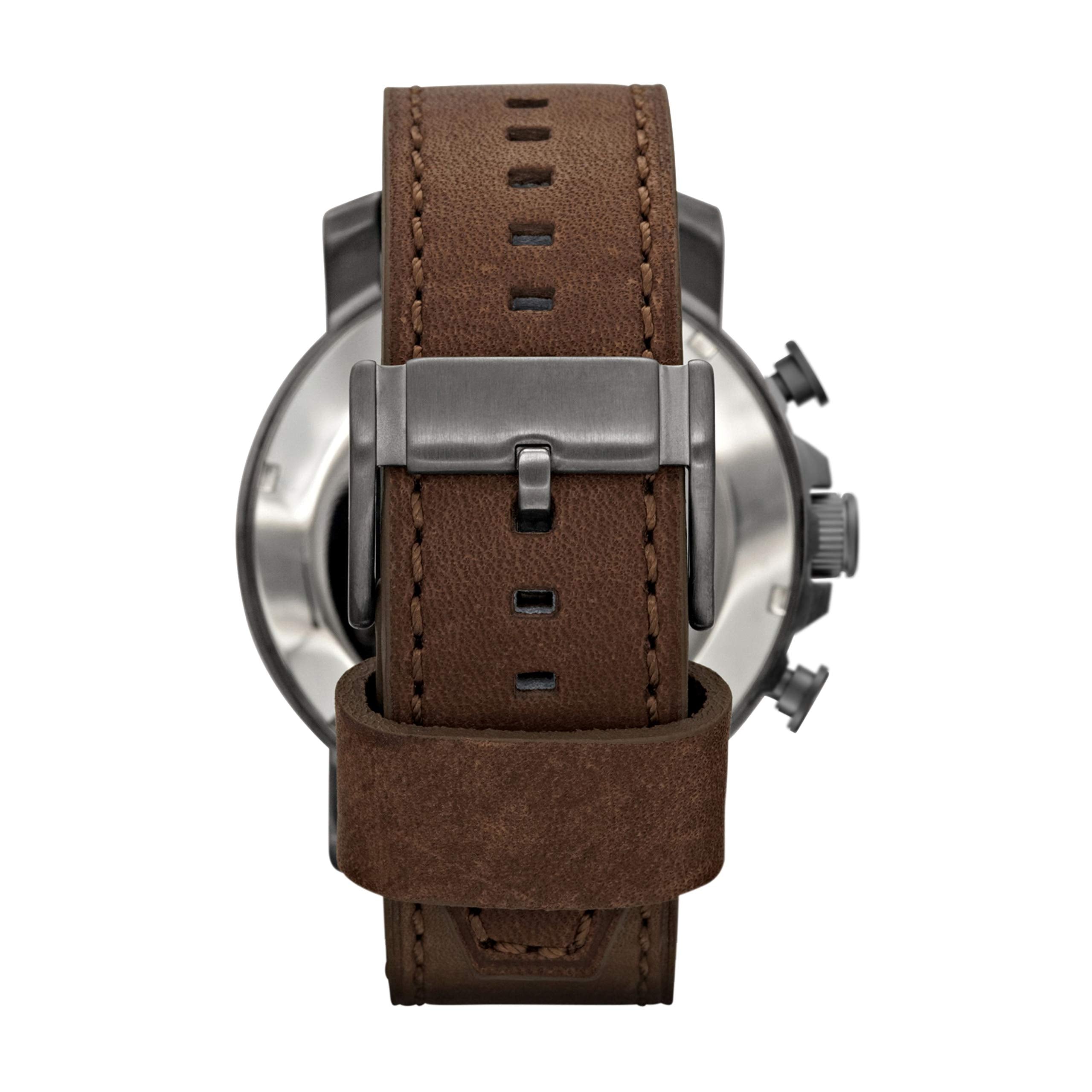 Watch Sizing Guide Wrist-flattering style is yours with this military-inspired timepiece from Fossil®. Stainless steel case. Leather strap with adjustable buckle closure. Three-hand analog display with quartz movement, three sub-dials and date display window. Chronograph functionality. Dial includes hour markers and minute track. Water resistant 5 ATM/50 meters. Imported. Measurements: Case Height: 50 mm Case Width: 50 mm Case Depth: 13 mm Band Width: 1 in Band Circumference/Length: 10 in Weight: 3.98 oz This product may have a manufacturer's . Please visit the manufacturer's website or contact us at @support.zappos.com for full manufacturer details.