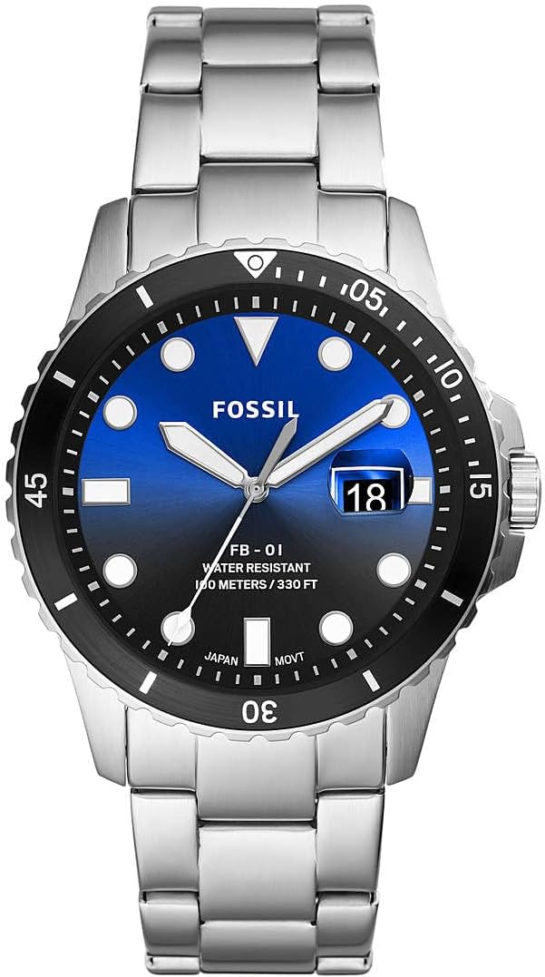 42mm case, mineral glass, 3 hand quartz movement, analogue display with date, 22mm band width. Round stainless-steel case with blue dial. Silver Tone, Stainless Steel Band. Water resistant to 100 metres: portable for bathing, swimming, snorkeling and diving in shallow water