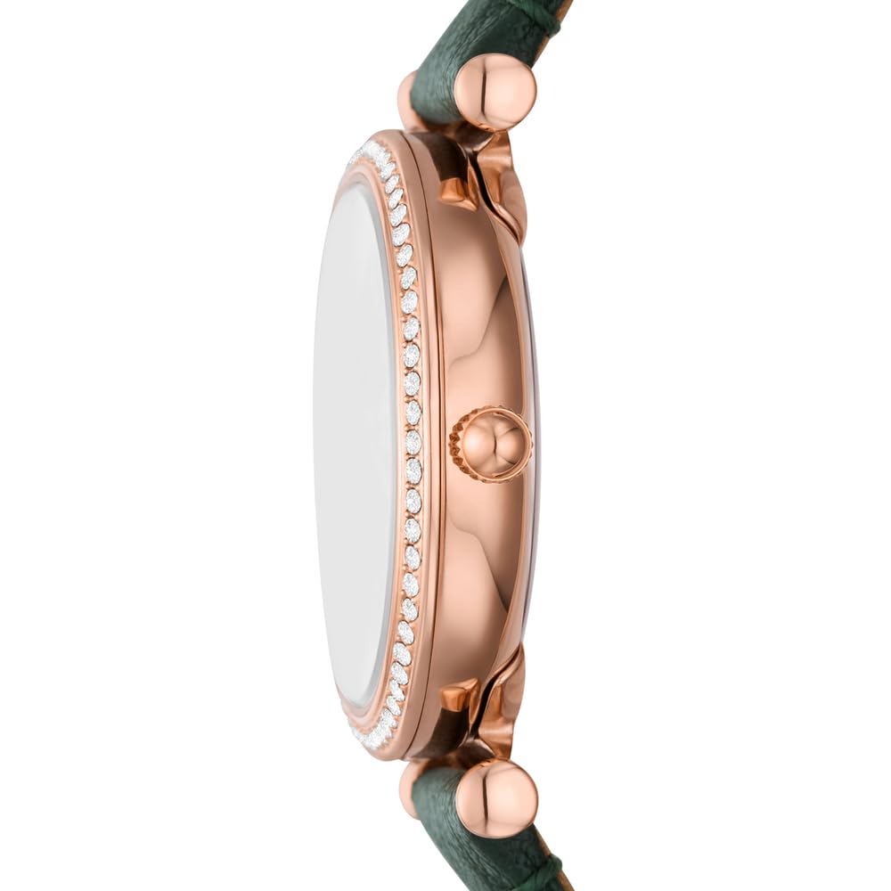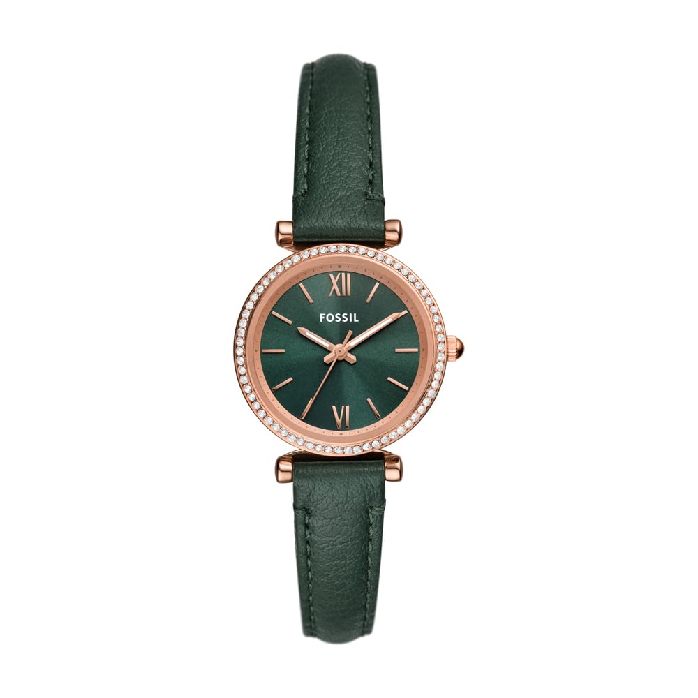 This 28 mm Carlie features a green sunray dial, three-hand movement and green LiteHide leather strap.