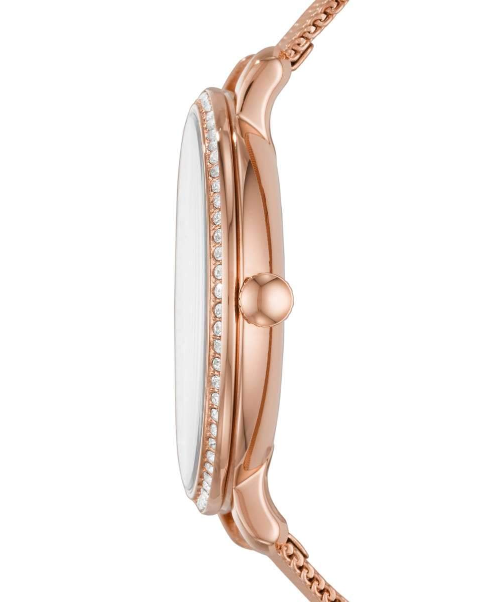 This 36mm Jacqueline features a rose gold-tone sunray dial with a glitz bezel, three-hand date movement and a rose gold-tone steel mesh bracelet.