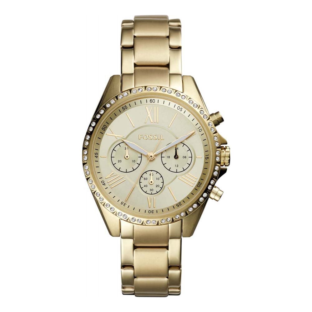 40MM case, 18mm band width, mineral crystal, Quartz movement with chronograph alog display. Round gold tone stainless steel case, with a gold tone dial. Gold tone, stainless steel bracelet. Water resistant up to 50m: Wearable while swimming in shallow water. Packed in a Fossil gift box