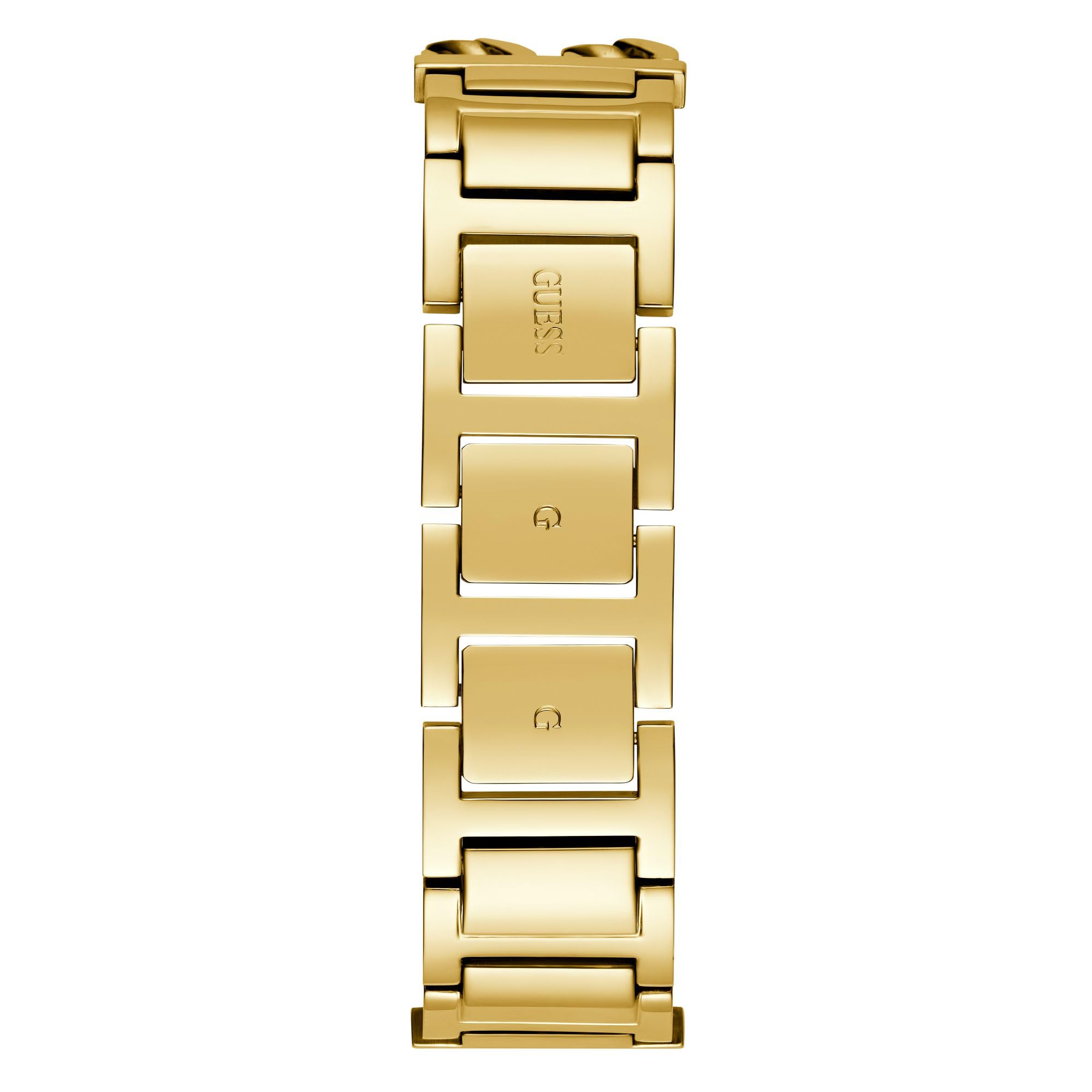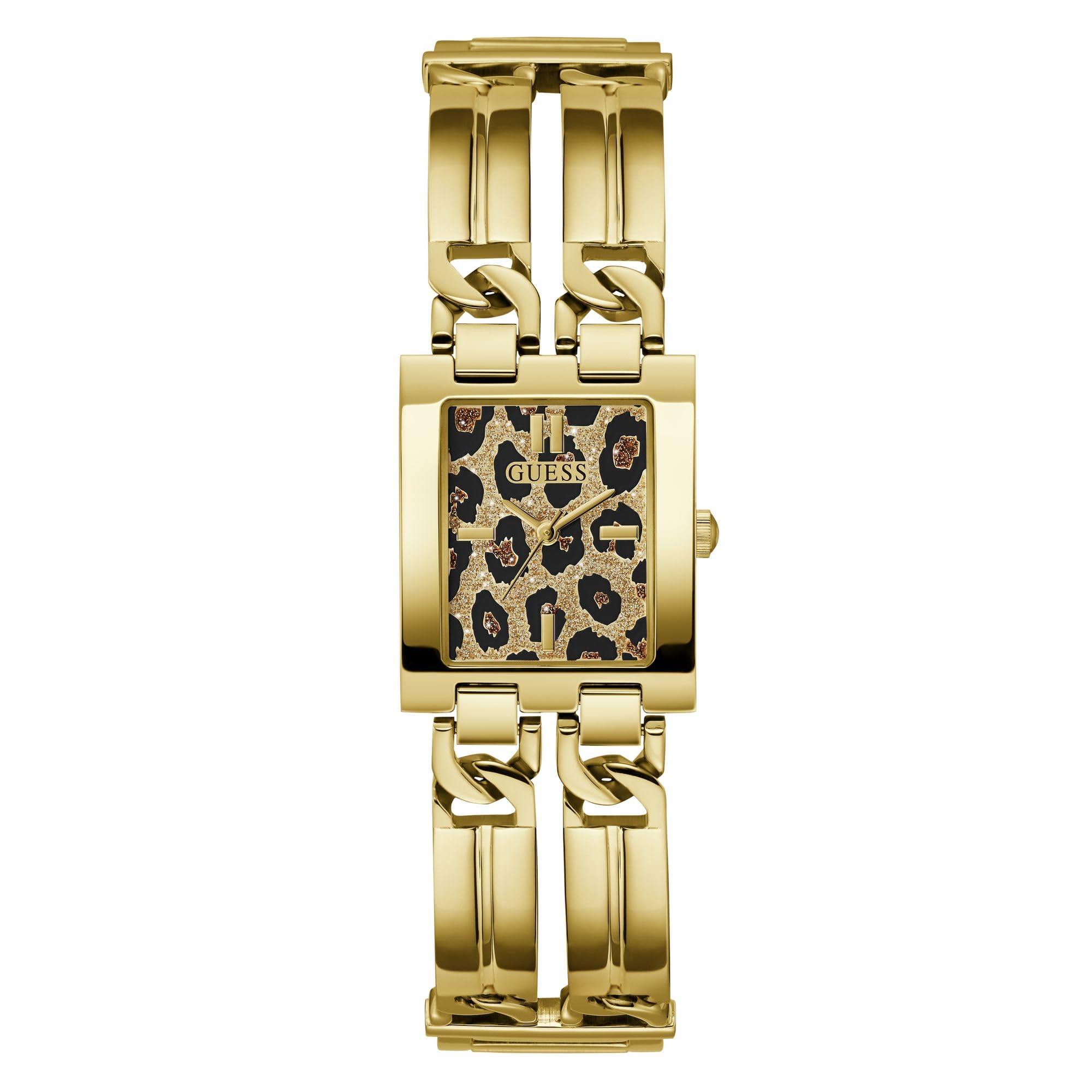 Manufacturer: Guess Model number: GW0807L2. Dial: analogue, colour: multi-coloured (animal print). Case: stainless steel case, gold. W x H approx. 24.00 x 29.00 mm (without crown), height approx. 7.70 mm. Case back: stainless steel with manufacturer's logo. Bracelet: stainless steel bracelet, gold. Width: approx. 1.9 cm. Length of the watch: approx. 19.0 cm. Flap closure. Waterproof: waterproof 3 A (30 m). Functions / displays: quartz movement, Hardened mineral glass. Hours, minutes, seconds display. Box contents: delivered in Guess packaging.