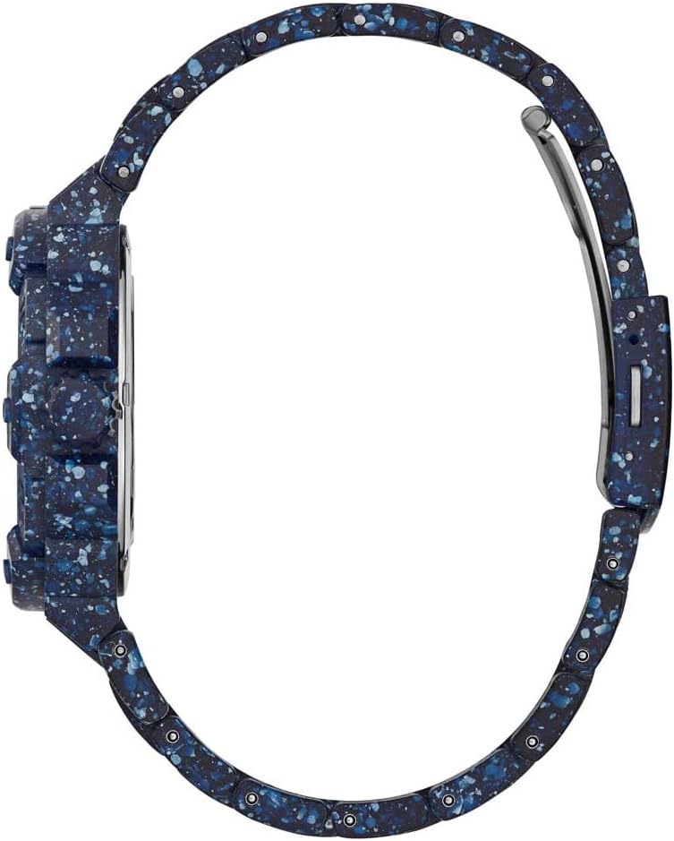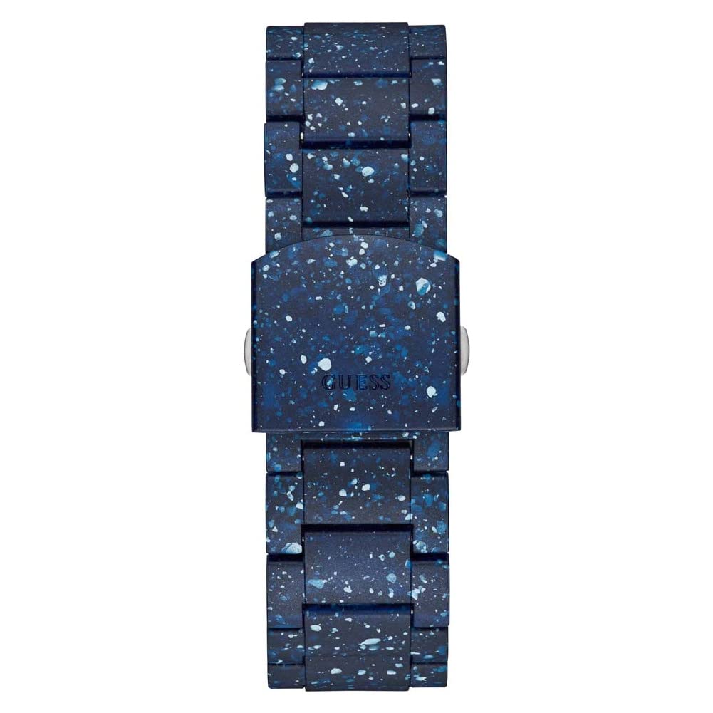 Made with recycled plastic collected from the ocean, this navy analog watch features a splattered design throughout the bracelet and case.