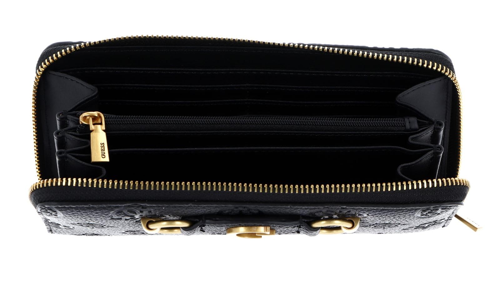 Facilities wallet: coin purse will be closed with zip. 12 compartments for credit, debit, business cards, etc. 2 side pockets for ID, calendar, photos, etc.1 sliding compartment for calendars, pictures, etc.2 compartments for banknotes1 zipped compartment for coins/small changeOn the back 1 compartment with zip. The GUESS logo is clearly visible