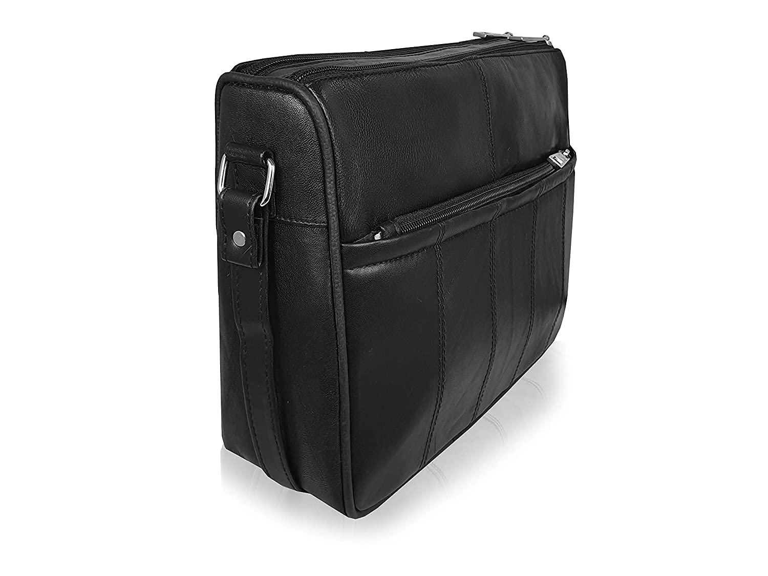 Quality women's shoulder handbag in soft black leather, small to medium underarm cross body style. Made in premium sheep's nappa, these across the body single strap style bags by K London are stylish and have convenience and practicality in mind. Features include 4 zipped pockets or sections. The two main compartments of these handy bags are full length and full height, inside one compartment is a small phone pocket and inside the other is a small zipped pocket. On the front and rear of this over the shoulders side bag, are two further zipped pockets which are full length and about two thirds in height. The bag is nylon lined on the inside, the long adjustable shoulder strap is matching faux leather for extra strength, as regular supple leather would not be strong and durable enough on a single strap bag.