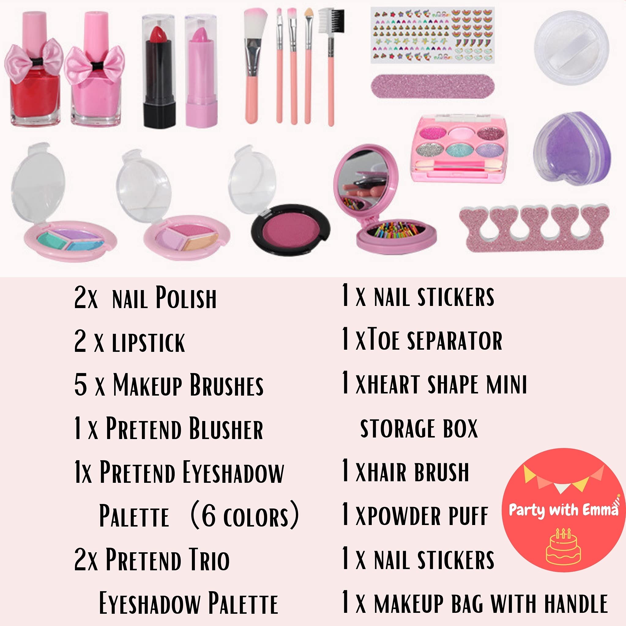 ✅SAFE MATERIAL all pieces of this girls makeup kit made by safe water material and harmless high-quality plastic materials, which can totally meet safety requirements for parents and children. 5 different sized makeup brushed are super soft on the kids’ sensitive ✅EASY TO CLEANEvery little girls may want to have her own makeup set like moms. Instead of getting into mommy’s makeup, providing them their own kids makeup set is a good way to avoid a mess. which will leave no marks on any surface so you don’t have to worry about cleaning their face and tidy up the house. Perfect for little makeup beginners. Also the playing process is great for enhancing hands-on skills and imagination