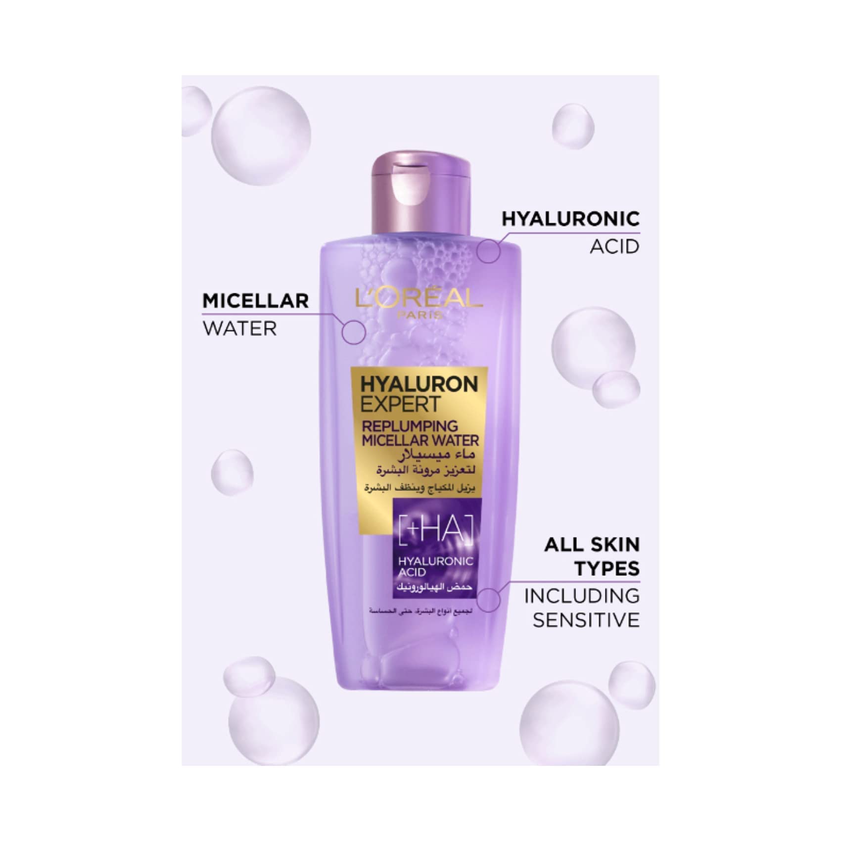 L'oréal paris introduces hyaluron expert replumping micellar water formulated with hyaluronic acid, a powerful dermatological active ingredient known for its re plumping and moisturising properties. A makeup remover that leaves your skin replumped and refreshed with hyaluron expert micellar water. Get the plumped look your skin is deserves with the full range of hyaluron expert.