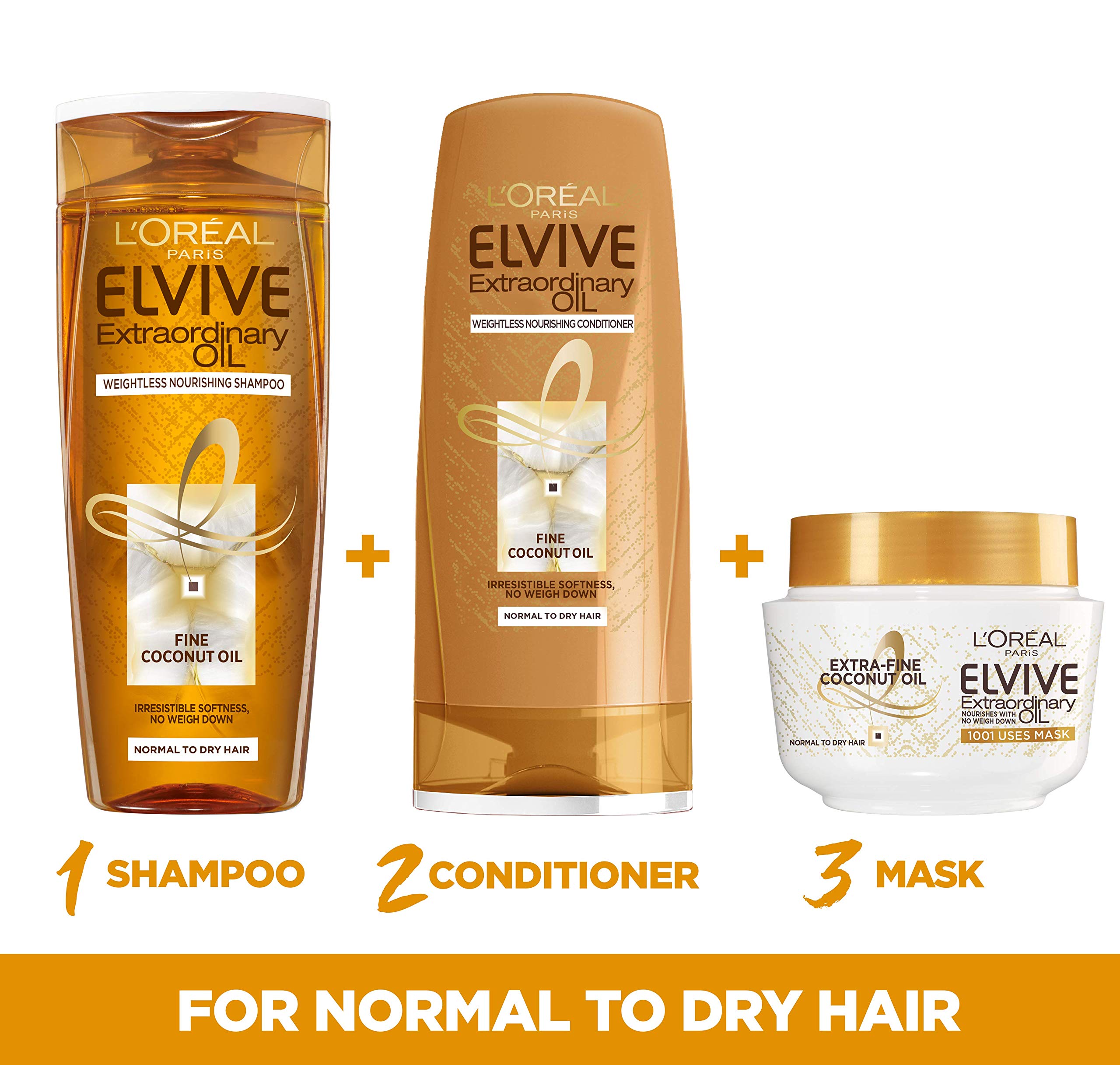 A luxurious texture infused with fine Coconut oil. Hair feels nourished and free-flowing with a sumptuous satin shine. Expert tailor-made care beyond beautiful hair goes well with L'Oreal Paris Elvive weightless nourishing shampoo with fine Coconut oil 400ml L'Oreal Paris Elvive weightless nourishing conditioner with fine Coconut oil 400ml rub 2 precious drops between the palms of your hands. Apply evenly through the lengths and ends of wet or dry hair. Before Shampoo for extra nourishment; before styling for smooth, free-flowing lengths; as a weightless finishing touch to help smooth flyaways and give a satin shine.