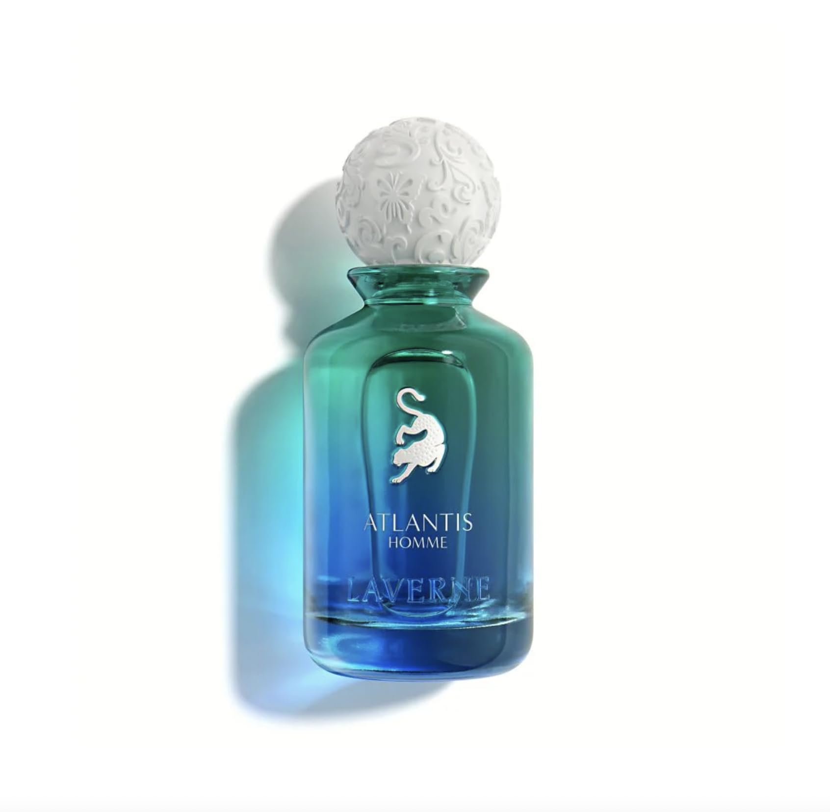 Discover the captivating allure of LAVERNE Atlantis Homme, a sophisticated fragrance that embodies modern masculinity. This exquisite 100 ml perfume features a stunning gradient bottle design transitioning from emerald green to deep ocean blue, topped with an elegantly textured white cap. The distinctive Atlantis logo and leaping animal motif add a touch of mystique to its premium presentation. Perfect for the contemporary gentleman, this fragrance makes an impressive addition to any collection or a thoughtful gift choice. The substantial 100 ml size ensures long-lasting enjoyment of this distinctive scent. The bottle's sophisticated design makes it a striking accent piece for any dresser or vanity while protecting the precious fragrance within. Experience the confidence and sophistication that LAVERNE Atlantis Homme brings to your daily routine.