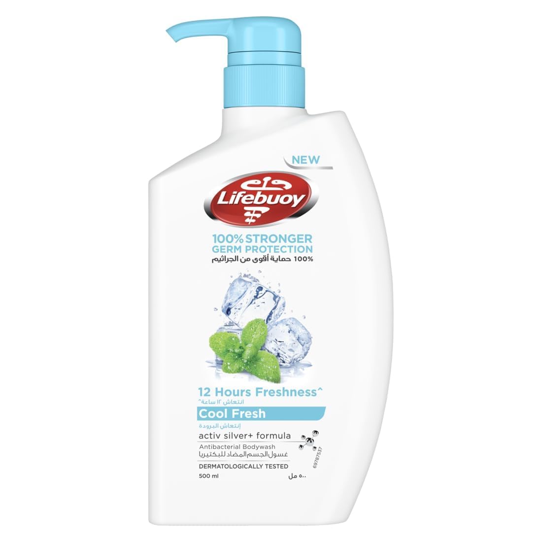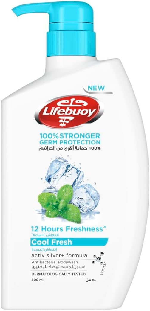Introducing Lifebuoyβs coolest and freshest body wash yet - Lifebuoy Cool Fresh! The antibacterial bodywash offers 100% stronger germ protection from viruses and other germs. Its rich lather penetrates deep into your pores to wash away every virus and germ. Infused with refreshing menthol, the cooling body wash can help you beat the heat by engulfing your whole body with odour protection and freshness for up to 12 hours. Keep your family protected with Lifebuoyβs advanced germ protection technology. Dermatologically tested, this hygienic bath gel is suitable for all skin types and is made with 100% recyclable material and 95% biodegradable formula. To activate the body washβs antibacterial benefits, wet a body scrub loofah and pour 2-3 drops of body wash onto the loofah. Squeeze the loofah to create lather, rub the body with the soap thoroughly, and rinse well. Skin cleansing and personal hygiene have never been easier, especially for kids. As Lifebuoyβs endless benefits cannot be squeezed into one bottle, try the brandβs full range of body washes including Lifebuoy Total 10, Mild Care, Lemon Fresh, Cool Fresh, Matcha Green Tea & Aloe Vera, Honey & Turmeric, Sea Mineral, Charcoal & Mint. *AS per lab test on indicator organism vs ordinary body wash without actives ** Based on NielsenIQ, Skin Cleansing Bars (unit sales) and Skin Cleansing Bars & Liquid Hand Wash, 2023
