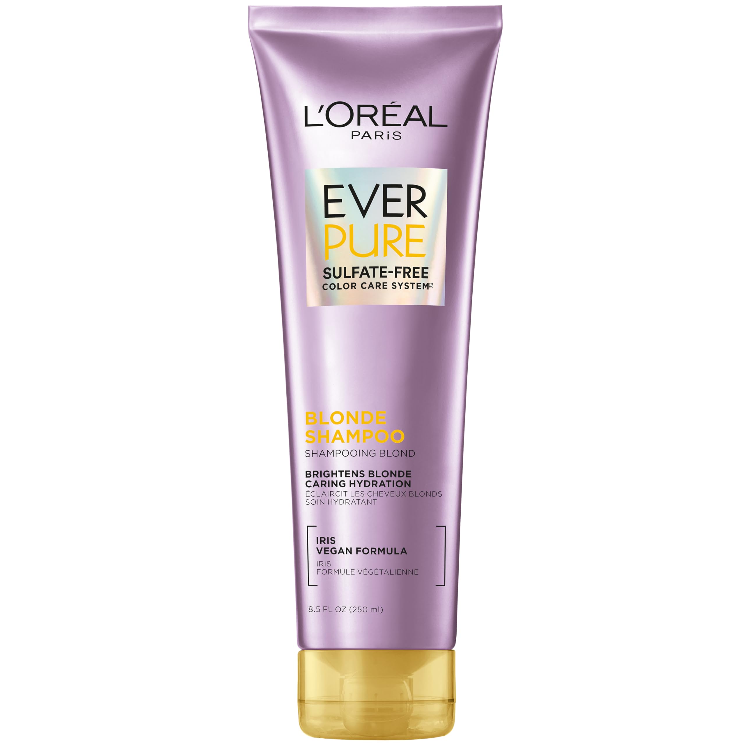 L'Oreal Paris EverPure Blonde sulfate free shampoo with iris neutralizes brassiness in just 1 use*. Deeply hydrates over-processed or damaged hair for pure shine and a soft, luxurious touch. Our formulas are especially gentle on color treated hair. There are no harsh sulfates, salts or surfactants that can strip, dull and damage hair. Experience a purely sensorial rich, creamy formula and a fresh aromatic fragrance that blooms. • Neutralizes Brassiness • Sulfate Free • Anti-Fade • Iris Botanicals *system of shampoo, conditioner, and treatment banishes by neutralizing brassiness Apply to wet hair and massage gently into a thick lather. Rinse thoroughly. Follow with EverPure Blonde conditioner. Use EverPure Blonde Shade Reviving Treatment once weekly.