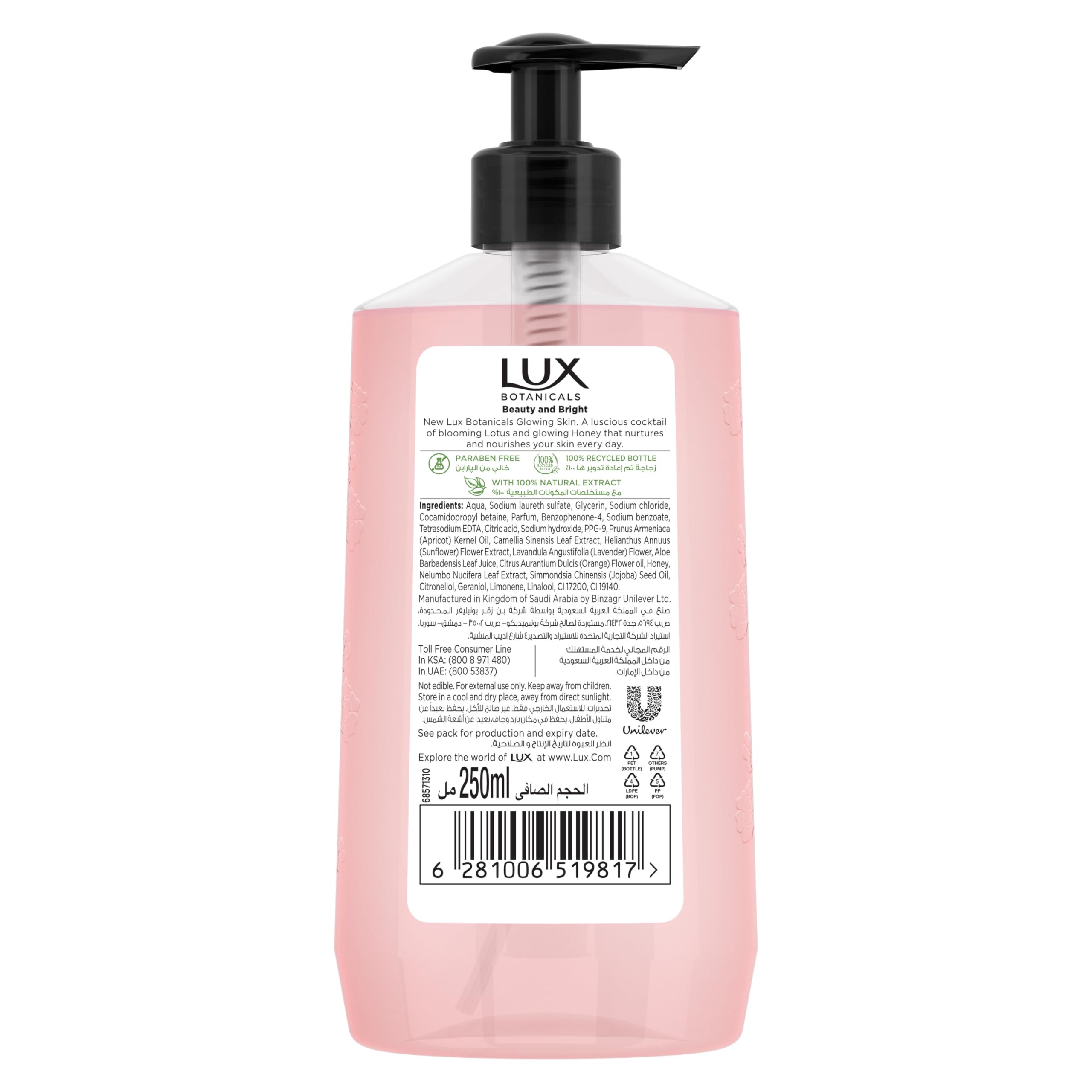 Introducing New Lux Botanicals Glowing Skin Hand Wash. A luscious mix of blooming Lotus and glowing Honey that nourishes your skin every day. Lux combines the finest fragrances with naturals formulation to pamper your skin with benefits to keep your hands protected, nourished, and beautifully scented with every wash. Experience the power of nature with the new lux botanicals range with 100% natural extracts. Enriched with a unique combination of exotic flowers and precious heritage natural beauty ingredients leaving your skin beautifully soft and delicately fragrant. Get nourished, beautiful and bright skin with a splashing luscious cocktail of lotus and honey to immerse yourself in. The perfect Middle Eastern escape that your skin needs. The new lux botanicals antibacterial range will give you rejuvenated skin that is enriched with precious botanical beauty and moisturizing ingredients. Feel the exotic accords to nurture your skin every day. It’s made with paraben-free, silicone-free formula with 100% natural extracts. With its hygiene properties, it gives you germ protection and hand sanitization, suitable for all skin types including sensitive skin. LUX ® for almost a century has been bringing the best of beauty and the pleasure that comes with it to women around the world. We inspire women to embrace their femininity and express their beauty beyond appearances. From the start, LUX® has been among the first to use Hollywood stars in our advertising. Since 1925, we have been embraced by iconic stars, and by all women who take strides forward while embracing their femininity. We’ve been working with the world’s best perfumers to create fine fragrance skin treats for you to enjoy. Transform your daily shower into an indulgent one that will make you feel special every day.