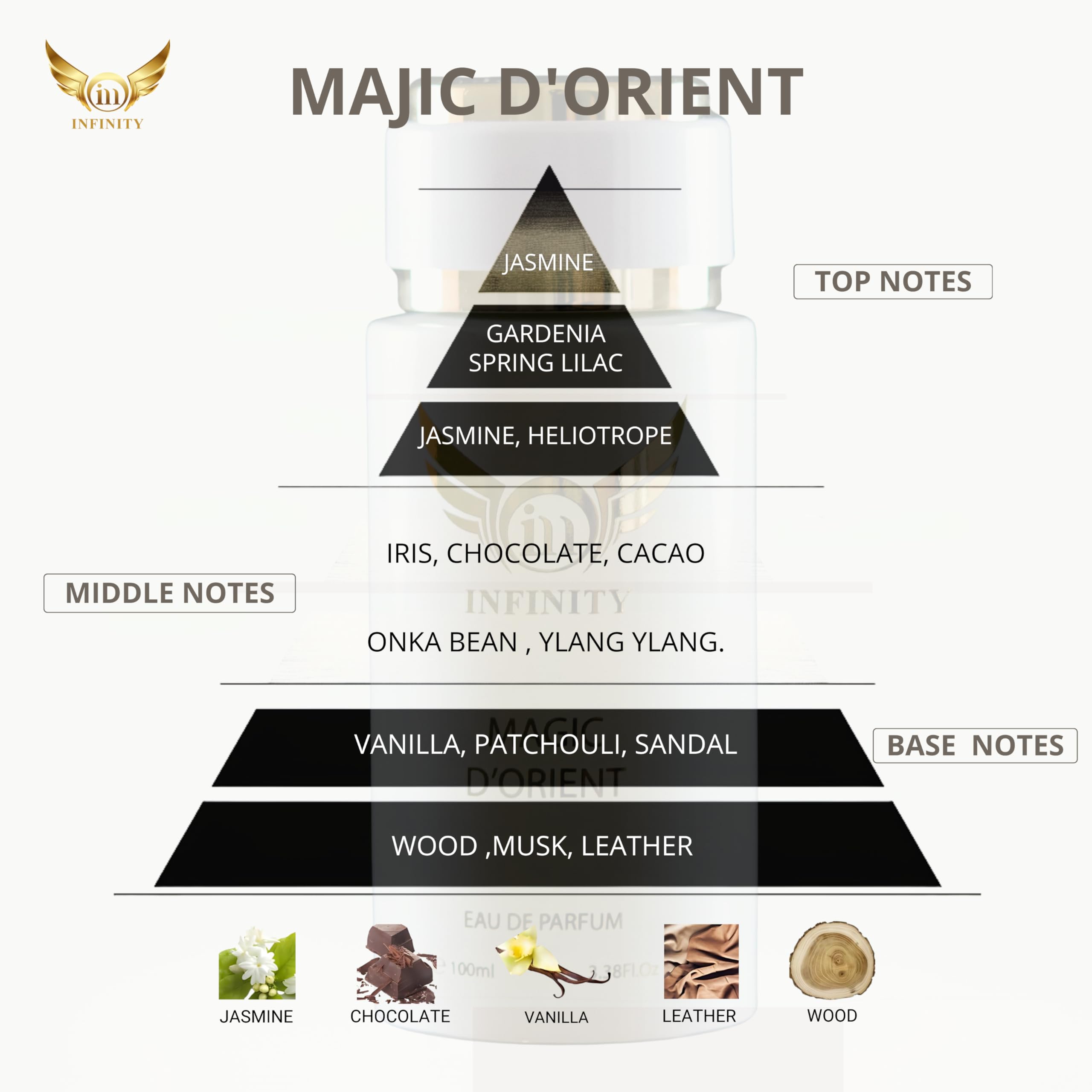 Experience the enchanting allure of MAJIC D'ORIENT, a luxurious fragrance crafted for the modern woman. The top notes of spring lilac, jasmine, gardenia, and heliotrope offer a floral and fresh opening, while the heart notes of iris, chocolate, cacao, tonka bean, and ylang-ylang create a rich, gourmand bouquet. The base notes of vanilla, patchouli, sandalwood, musk, and leather provide a warm and sensual finish. Perfect for any occasion, this 100ml perfume embodies elegance and mystery.
