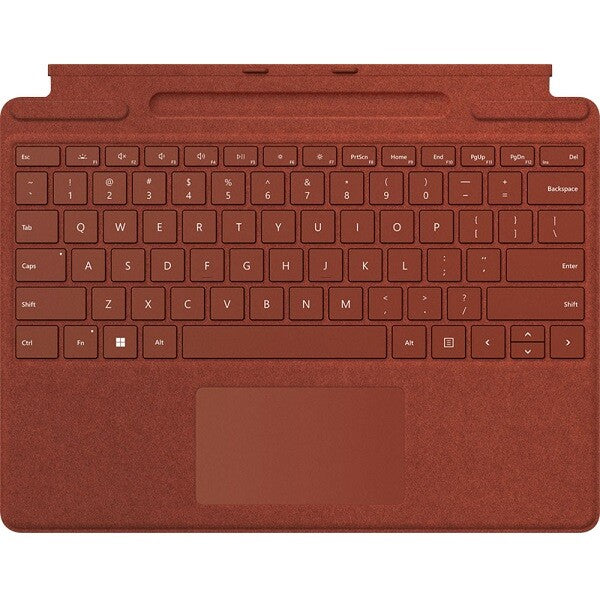 Enjoy a smooth and elegant typing experience while using your Surface Pro 8, Surface Pro 9, or Surface Pro X with the Microsoft Surface Pro Signature Keyboard. Made with luxurious Alcantara material, this stylish poppy red mechanical keyboard cover attaches magnetically to your Surface Pro device to provide a smooth typing experience in almost any situation, whether you're working from your lap or at a desk. It also helps to optimize your workflow with a large glass touchpad along with Windows shortcut, media control, right click, and brightness adjustment buttons. Additionally, its convenient tray securely stores and recharges your Surface Slim Pen 2, keeping it ready and close by when you need it. Once you're done, simply close the cover to protect your screen while traveling.