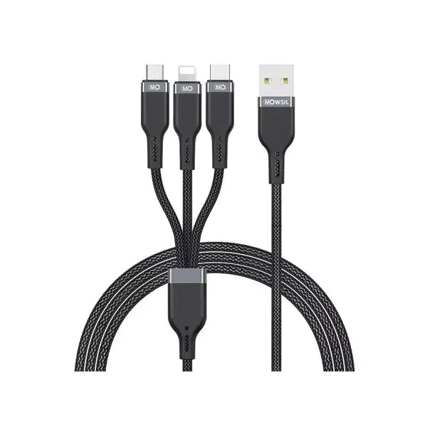 - The Mowsil 3in1 cable is a universal cable equipped with different connectors for quick charging in three devices. The cable is equipped with a standard USB input and 3 connectors with different Micro-USB, Lightning and Type-C terminals to connect three different devices with different ports to power.