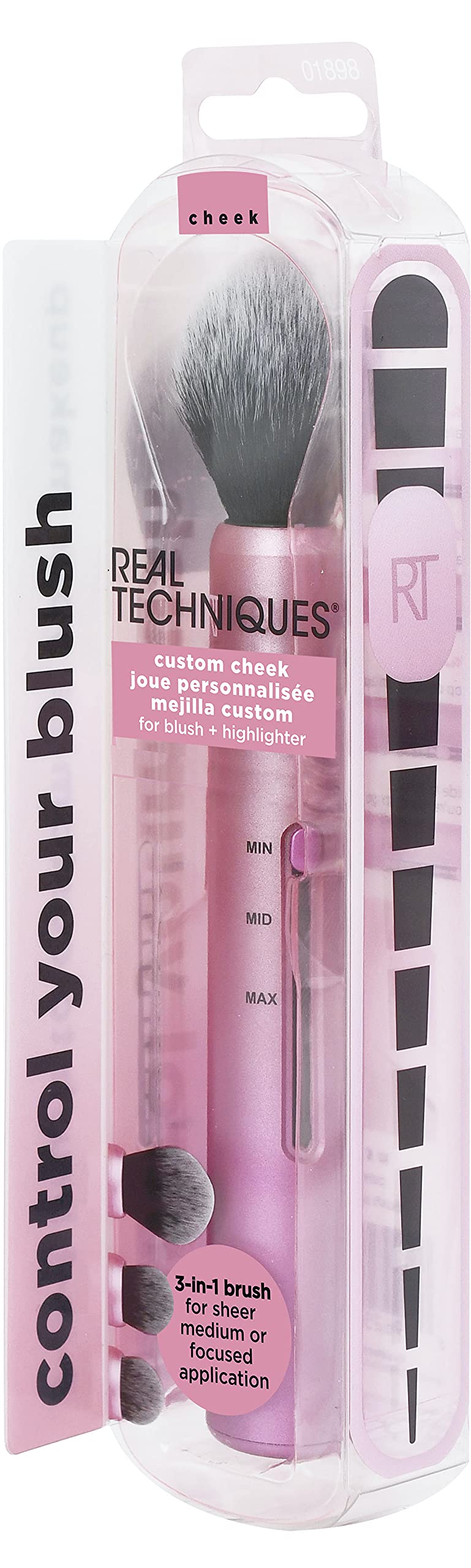 Create a flawless flush with the Real Techniques Custom Cheek Brush. This innovative brush allows full customizable density, allowing to expertly blend a range of blush formulas. Soft synthetic bristles blend liquid, cream and powder products seamlessly. Lending itself to both cream and powder formulas, the 3-in-1 makeup brush features an adjustable slider spectrum to deliver varying levels of definition – Level 1 for maximum coverage, Level 2 for medium coverage and Level 3 for minimum coverage. An angular brush head with compact bristles perfectly adheres itself to the contours of the face. Simply click the slider to adjust the coverage level. Real Techniques is one of the first brands to bring prestige quality, award-winning, and innovative tools at a great value to the beauty obsessed around the world. Since 2011, we have been creating tools and accessories to help make the most of your favorite makeup. With a beauty community of over 5 million, Real Techniques strives to inspire, educate, and empower our fans to make the most of their favorite products. Whether you’re striving for your best no-makeup look or about to make your runway debut, Real Techniques has the perfect tool for you. Our Brushes Take your look to the next level with our individual brushes and brush sets. From foundation to eye shadow and from cream blush to setting powder, accentuate your favorite features. Our lightweight, prestige quality, easy to use, and easy to clean brushes help you create defined contours, build coverage, and layer on your best makeup looks. Our Sponges Optimize your beauty routine with our versatile makeup sponges, designed with a revolutionary latex-free foam technology to evenly blend makeup for a smooth, enhanced finish. Our miracle sponges can be used damp or dry. As the makers of the #1 Makeup Sponge*, the Miracle Complexion Sponge®, we bring you the perfect sponges to help you: build coverage with liquid foundation, smooth on seamless powder, blend body makeup, and much more!
