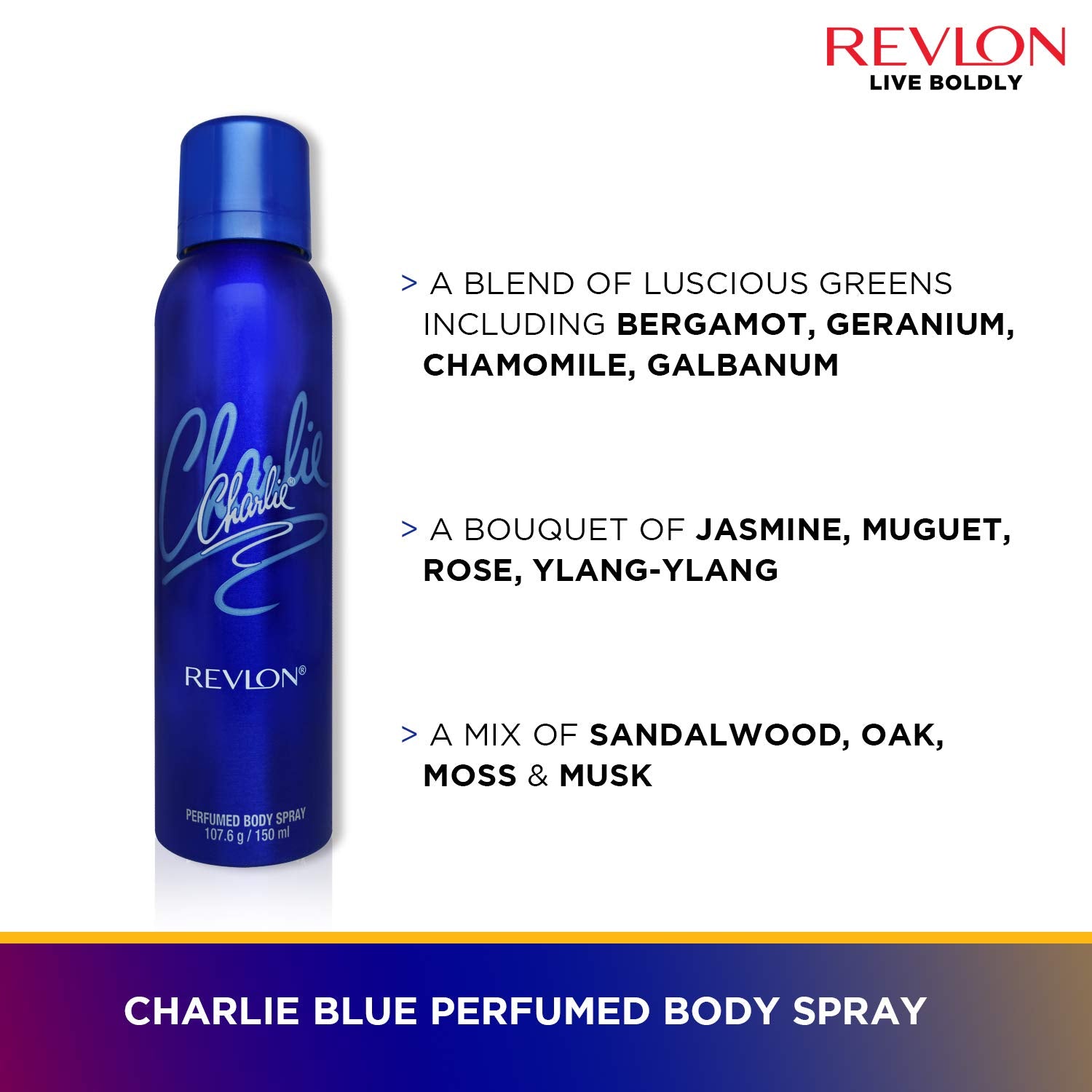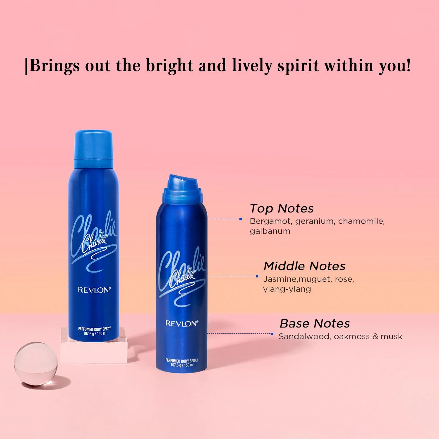 Revlon Charlie blue perfumed body spray, 150mlTop note β A blend of luscious greens including Bergamot, Geranium, Chamomile, Galbanum. Middle note - An bouquet of Jasmine, rose, Muget, Ylang-ylang. Base note - A mix of sandalwood, Oak Moss and Musk. Charlie is classified as a sharp, flowery fragrance. Accompanied by additional green notes of fresh cut grass and crisp leaves. This feminine scent possesses a blend of rose, oakmoss and sandalwood. Revlon Charlie red perfumed body spray, 150mlTop note - An irresistible mix of Black Currant buds, Orange Flower, Violet Leaf and Nasturtium. Middle note - A lush backdrop of rose, Jasmine, lily of the Valley, Ylang-ylang and Plum Apricot. Base note β Contains essence of Ambery, Vanilla, Heliotrope Flower, Tonka Beans. Charlie is classified as a sharp, flowery fragrance. Lovely fragrance. Reasonably priced. Good for everyday use. Revlon Charlie gold perfumed body spray, 150mlTop note - An irresistible mix of Peach, Apricot, Plum, Citrus and Violet leaves. Middle note β An eloquent bouquet of Jasmine, Rose, Muguet, Fressia and Cinnamon. Base note β A lush backdrop of Sandalwood, Cedar wood, Vanilla, Caramel Musk and Woody accords. Charlie is classified as a sharp, flowery fragrance. Lovely fragrance. Pocket friendly. Good for everyday use.
