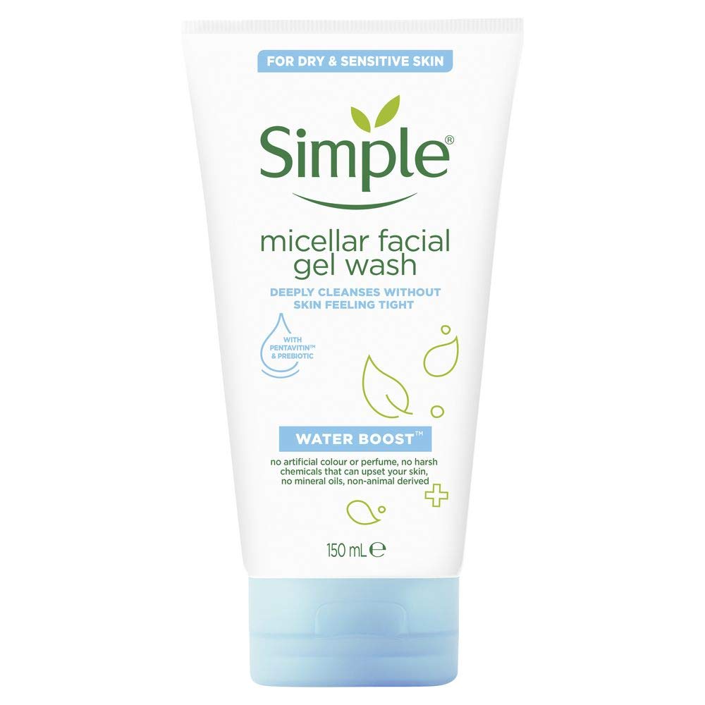 Introducing new Simple Water Boost Micellar Facial Gel Wash, a new generation face wash with Micellar technology, infused with skin-essential minerals and plant extract, this formula delivers instant hydration AND gentle yet effective cleansing β perfect for even sensitive skin. Facial cleansing is an important part of a healthy skincare regime. However, some cleansers and face washes are harsh and can strip away natural oils from the skin, making it dry and dehydrated. Simple Water Boost Micellar Facial Gel Wash has a light, hydrating water-gel formulation and is specially designed for dehydrated, dry or sensitive skin to gently and effectively cleanse while leaving skin feeling supple, comfortable and instantly refreshed. No over-drying or feelings of tightness! Β Lightweight on your skin, our micellar cleansing bubbles glide over your face, attracting make-up and dirt to gently yet effectively cleanse and refresh your skin. Β Infused with skin-essential minerals and a plant extract, this Simple Water Boost Micellar Facial cleanser Gel Wash instantly re-hydrates your skin, leaving it feeling soft, smooth and hydrated. Similar to all our Simple products, Simple Water Boost Micellar Cleansing Water contains no harsh chemicals, artificial colours or perfume, making it perfectly suitable for dehydrated, dry or sensitive skin. Simple Water Boost Micellar Facial Gel Wash is part of the new Simple Water Boost skincare range, specifically dedicated to reversing the 5 signs of dehydration: dryness, roughness, feelings of tightness, dullness and dry dehydration lines; to leave skin revitalised, supple and dewy fresh. Β Why not try out our other products in the Simple Water Boost range to help keep your skin hydrated? Β After cleansing with Simple Water Boost Micellar Facial Gel Wash, we recommend applying Simple Water Boost Hydrating Booster all over your face to instantly moisturise your skin and help it stay hydrated for longer. Finish with Simple Hydrating Light Moisturiser to complete your hydration skincare routine.