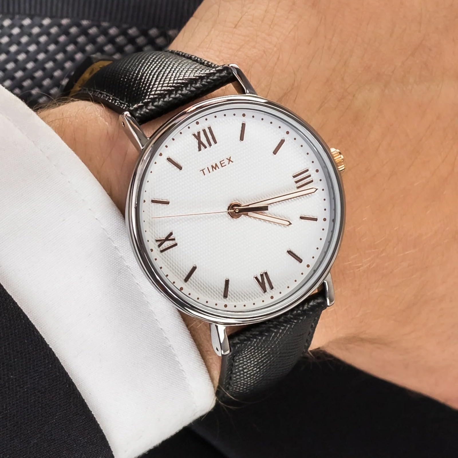 We’ve combined elevated style with the precision craftsmanship you’ve come to expect from Timex. The blue dial and two-tone 41mm case paired with a rich brown leather 20mm slip-thru strap gives you a refined look you can wear from day to night. The dial is marked with gold-tone partial Roman numerals and indices. Luminous hands aid with readability in low lighting. This watch is water resistant to 30 meters (99 feet).