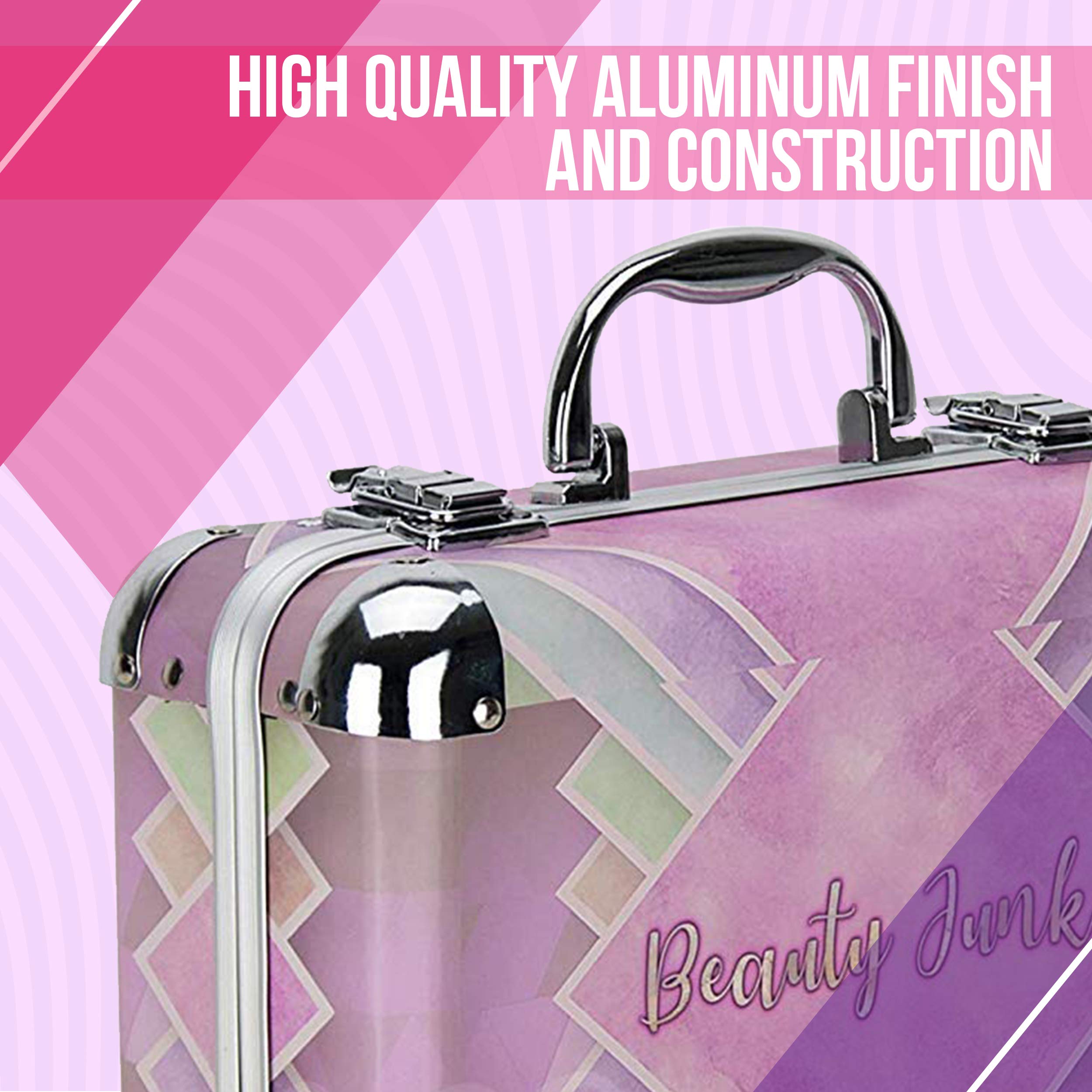 Professional Makeup Gift Set Keep all your cosmetics neatly organized! Featuring 2 extendable easy-slide accordion trays, a large bottom compartment, and a built-in mirror under the lid, this makeup travel suitcase comes in a stylish ‘Beauty Junkie’ pastel design. The makeup kit includes: Eyeshadow, blush, lipstick, lip gloss, and lip balm Face, lip and eye brush, tweezer, and nail file Separator, clipper, scissors, and sponge Its high quality aluminum finish and construction with reinforced steel corners provide extra protection and durability, and the heavy duty handle offers added comfort and grip. Plus, the easy-close latches with key locks enhance the security of your makeup tools. Designed with the most convenient dimensions to store, carry, and travel, this small makeup set measures 10.25" x 6.5" x 3.75".