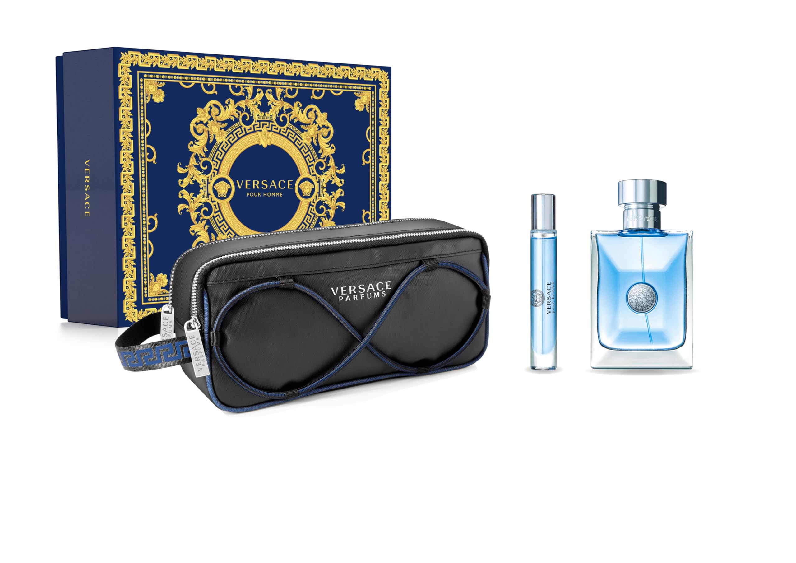 Versace Pour Homme Natural EDT Spray with Pouch for Men 3-Piece Gift Set The perfume, a classic and amazingly contemporary one, awakens all the senses. Ingredients of Mediterranean origin (Calabrian lemon, bitter orange leaves, etc.) give it warmth and strength.